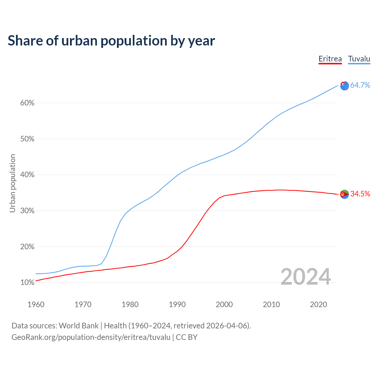 From 2004 to 2024, the share of urban population changed from 34.9% to 34.5% in Eritrea and from 48.4% to 64.7% in Tuvalu.