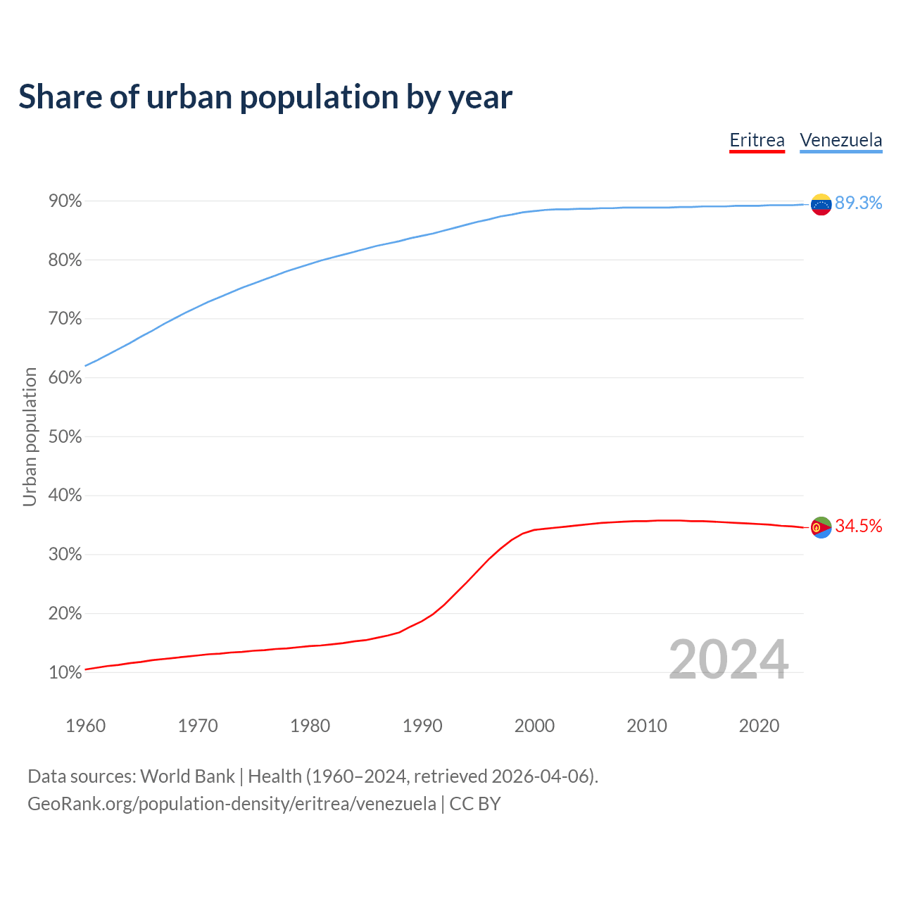 From 2004 to 2024, the share of urban population changed from 34.9% to 34.5% in Eritrea and from 88.6% to 89.3% in Venezuela.