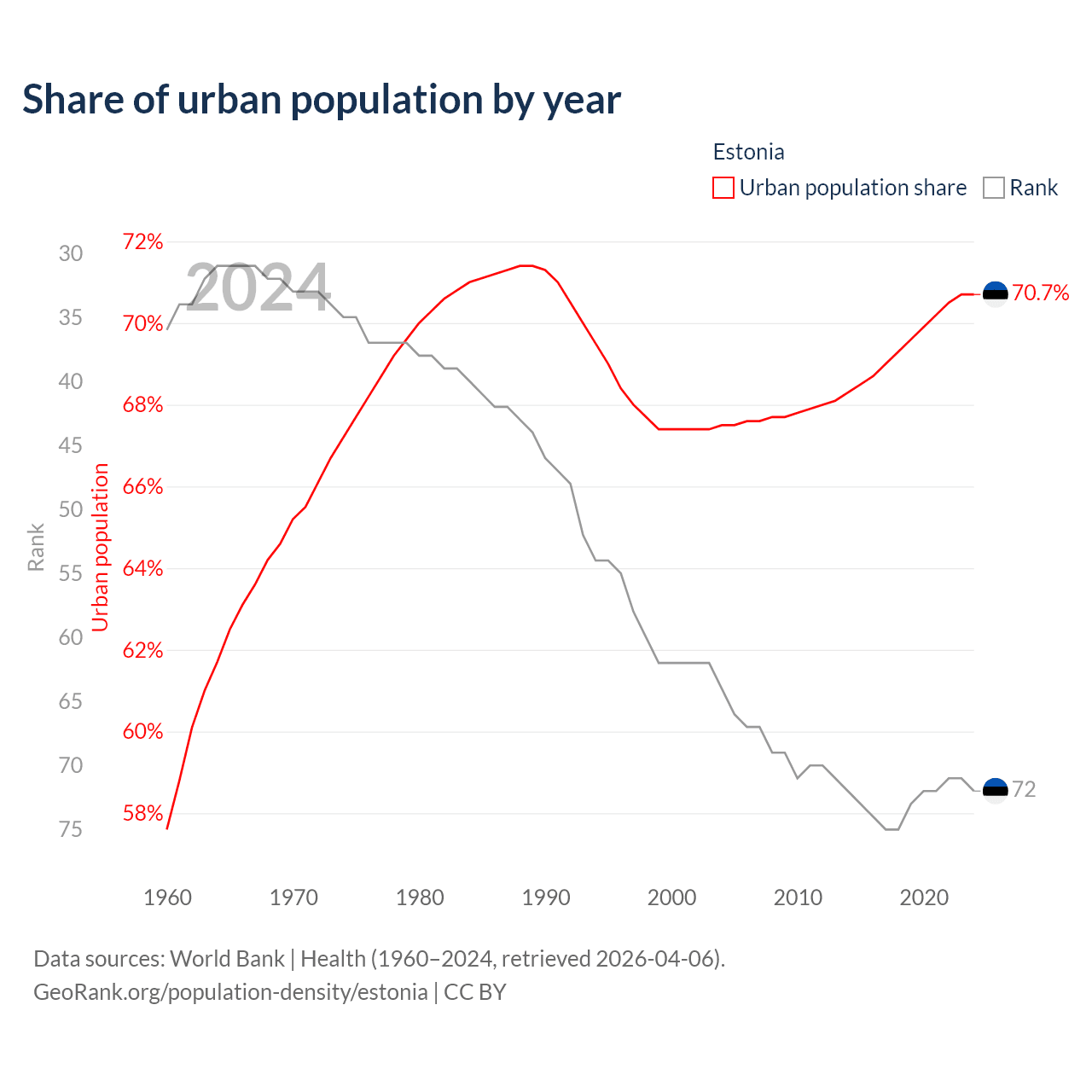 This chart shows the share of urban population in Estonia from 1960 to 2024: 57.6% lived in urban areas in 1960, 67.4% in 2000, and 70.7% in 2024.