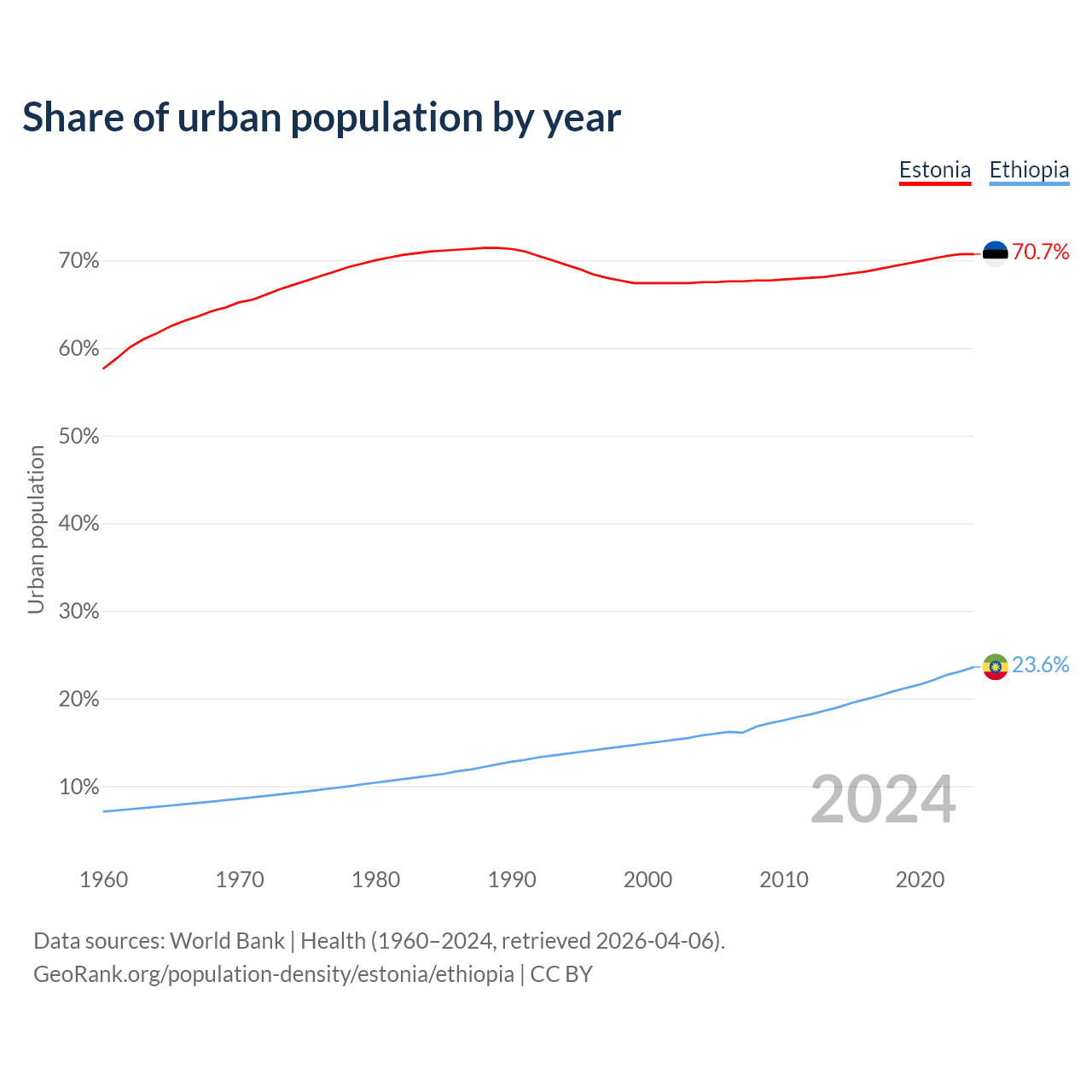 From 2004 to 2024, the share of urban population changed from 67.5% to 70.7% in Estonia and from 15.8% to 23.6% in Ethiopia.