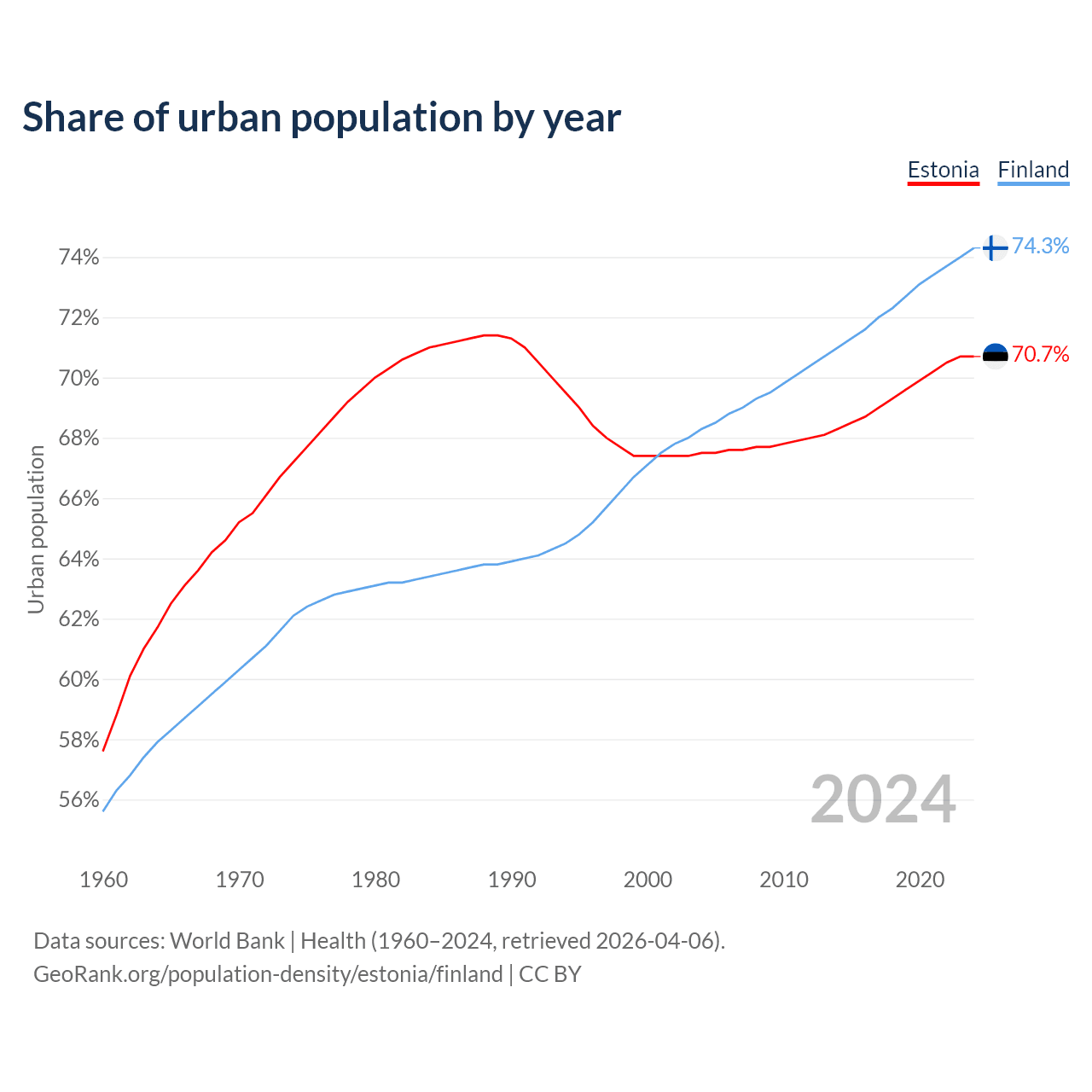 From 2004 to 2024, the share of urban population changed from 67.5% to 70.7% in Estonia and from 68.3% to 74.3% in Finland.