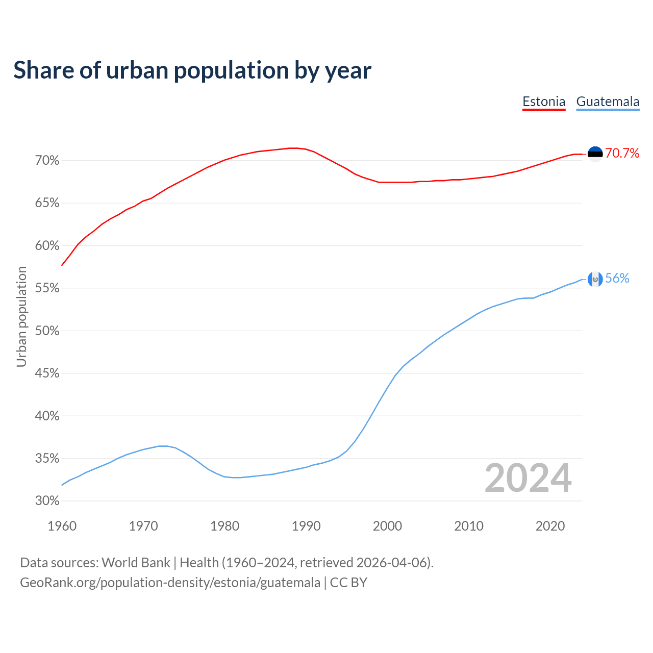 From 2004 to 2024, the share of urban population changed from 67.5% to 70.7% in Estonia and from 47.3% to 56% in Guatemala.