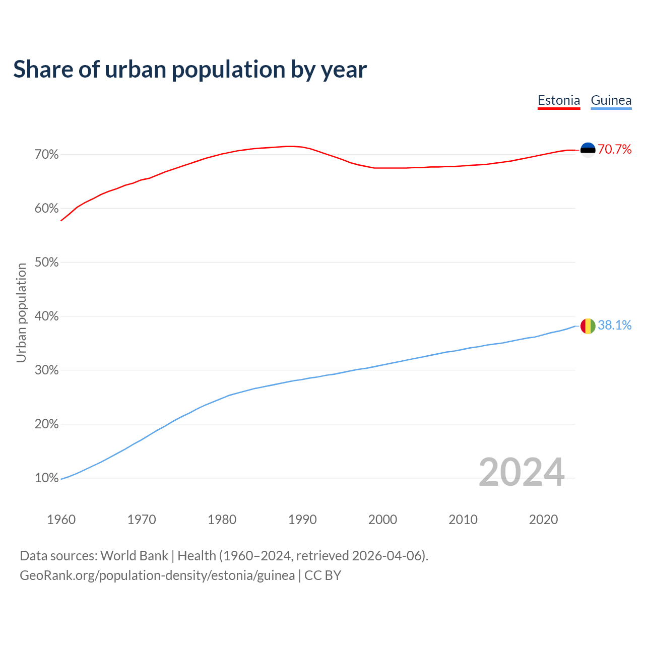 From 2004 to 2024, the share of urban population changed from 67.5% to 70.7% in Estonia and from 32.1% to 38.1% in Guinea.