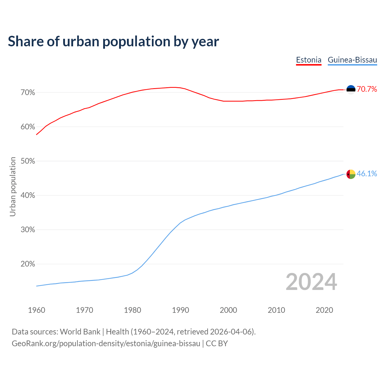 From 2004 to 2024, the share of urban population changed from 67.5% to 70.7% in Estonia and from 38.1% to 46.1% in Guinea-Bissau.