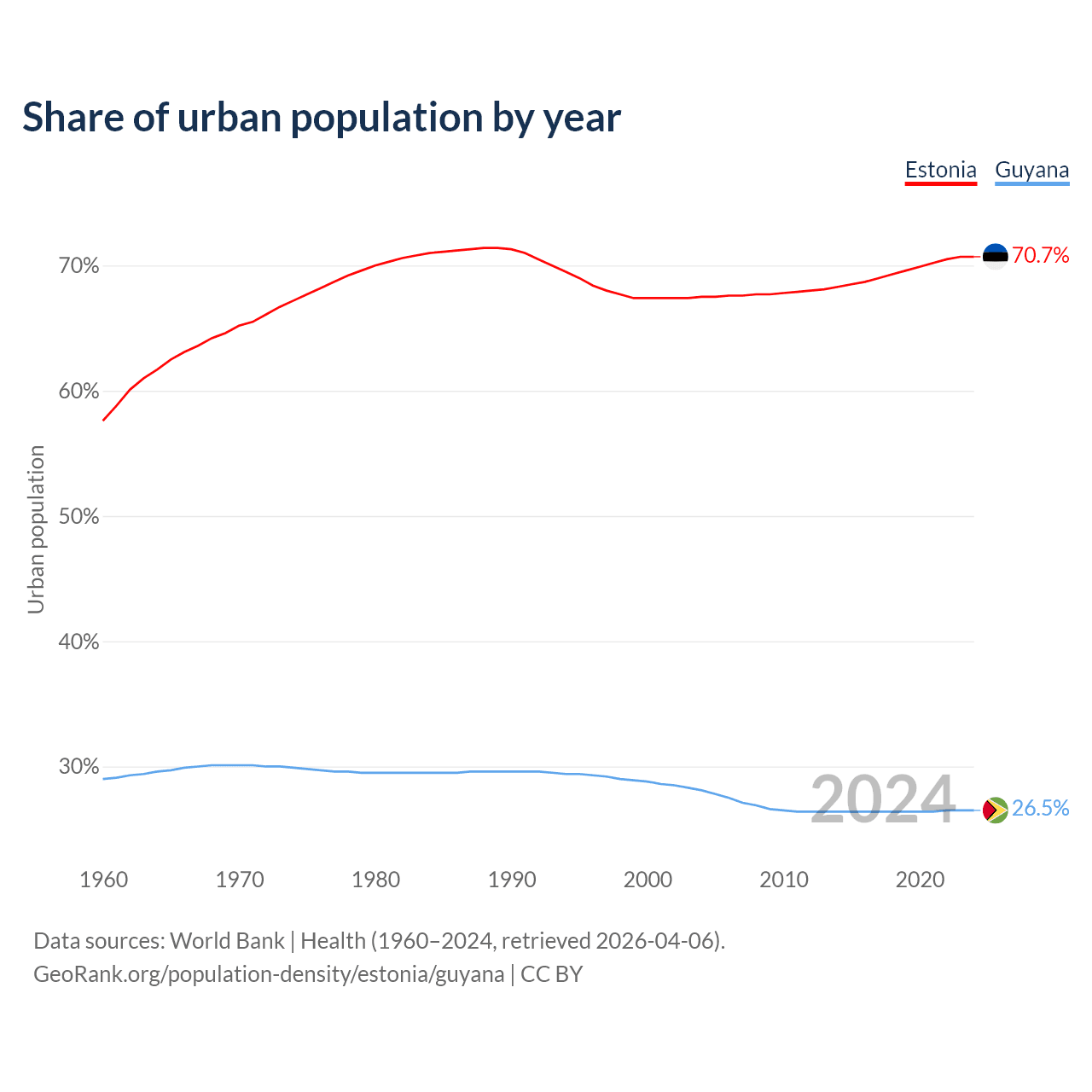 From 2006 to 2026, population density in Estonia decreased by 1.33%, compared to a 3.3% growth in Guyana.
