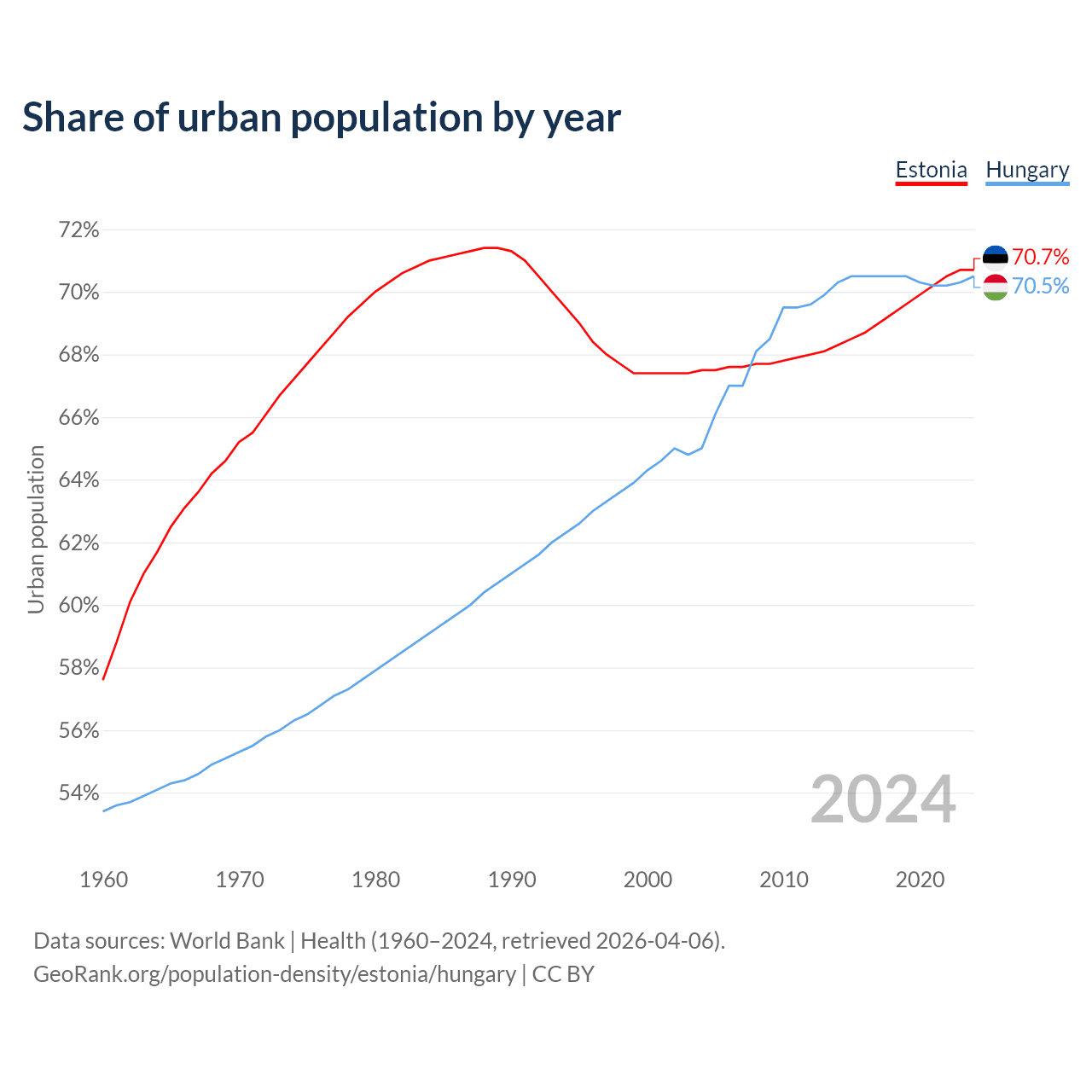 From 2004 to 2024, the share of urban population changed from 67.5% to 70.7% in Estonia and from 65% to 70.5% in Hungary.