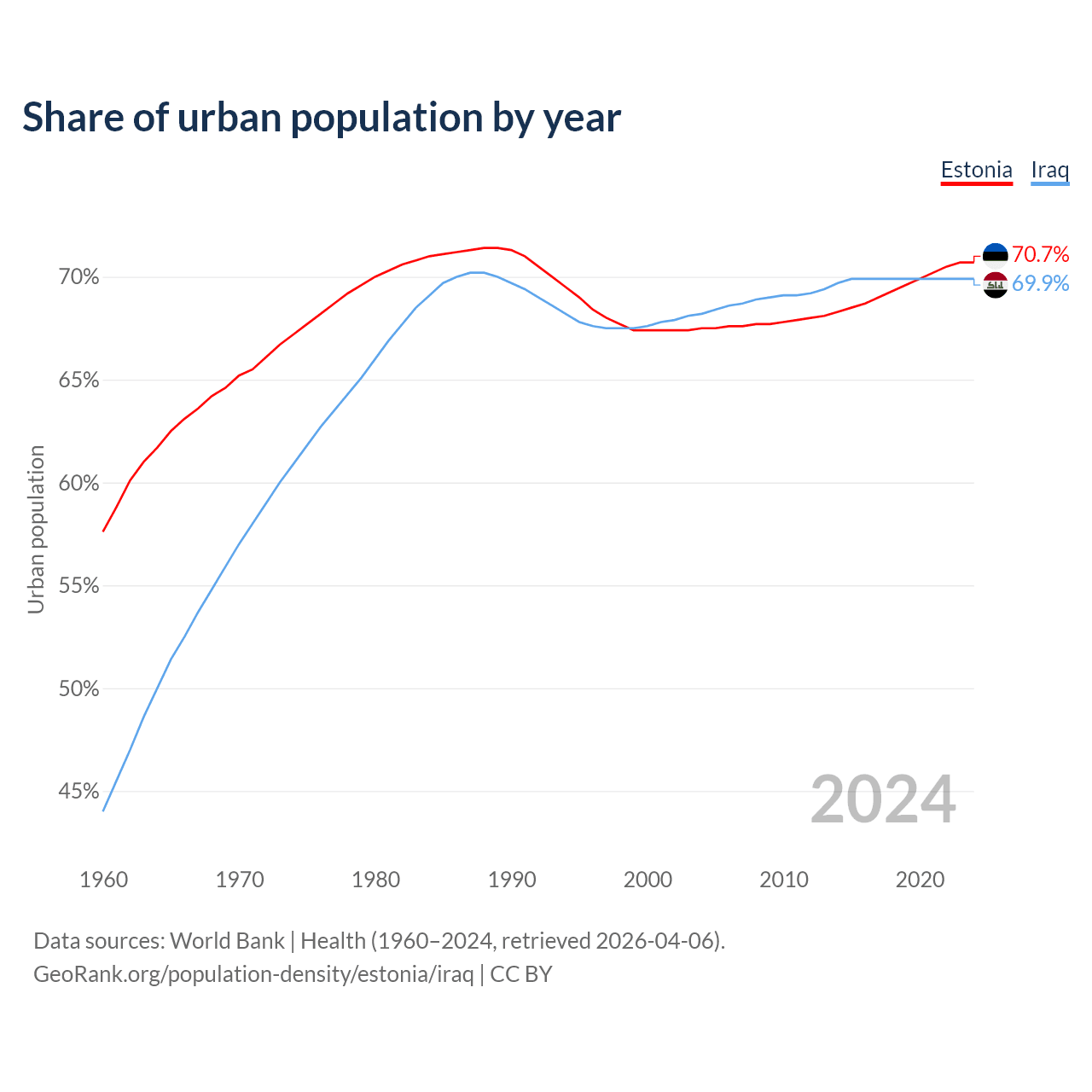 From 2004 to 2024, the share of urban population changed from 67.5% to 70.7% in Estonia and from 68.2% to 69.9% in Iraq.