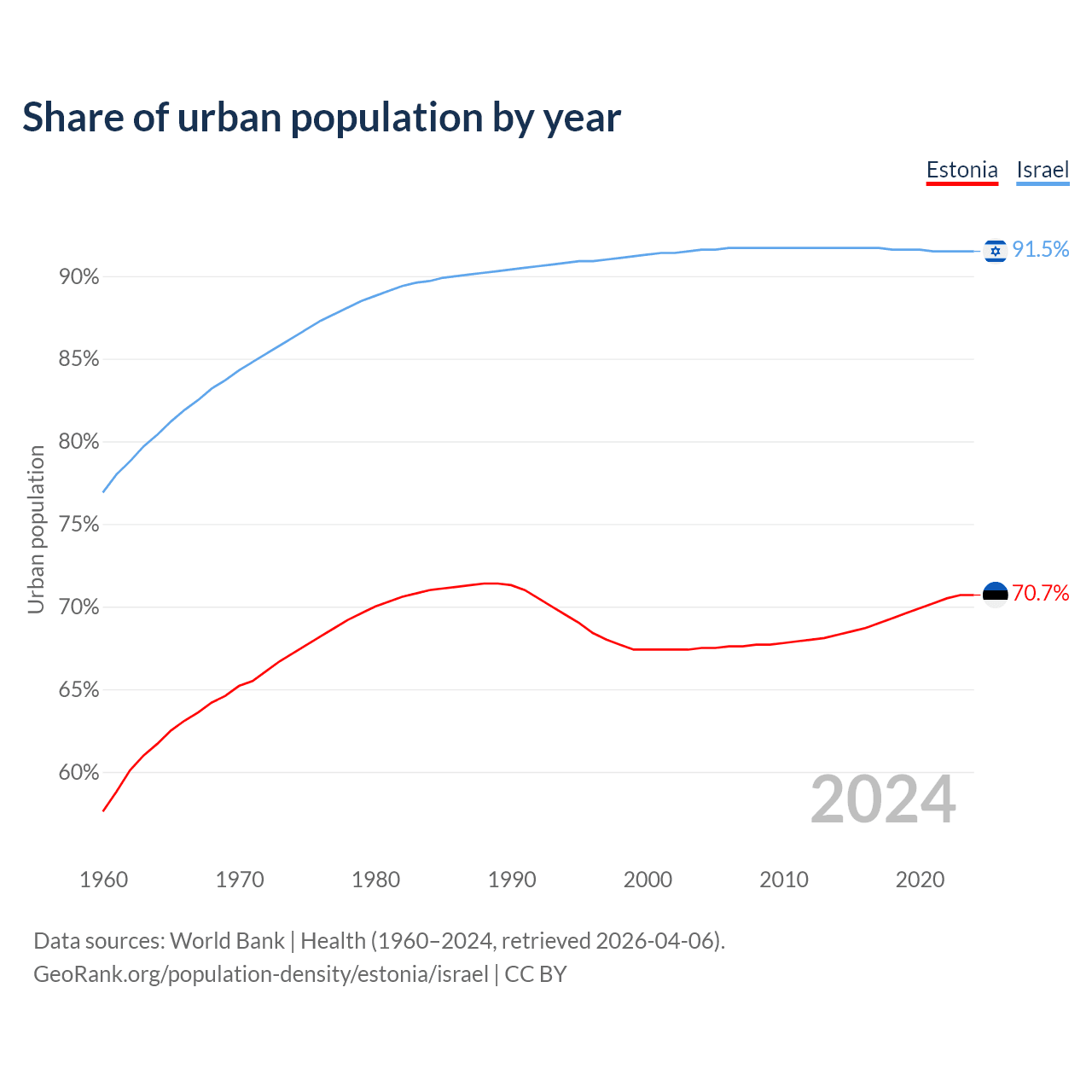 From 2004 to 2024, the share of urban population changed from 67.5% to 70.7% in Estonia and from 91.6% to 91.5% in Israel.