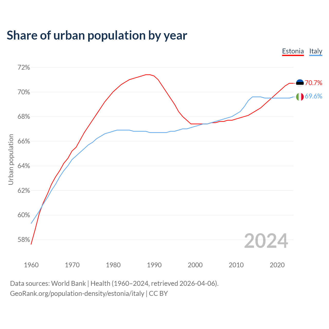 From 2004 to 2024, the share of urban population changed from 67.5% to 70.7% in Estonia and from 67.5% to 69.6% in Italy.