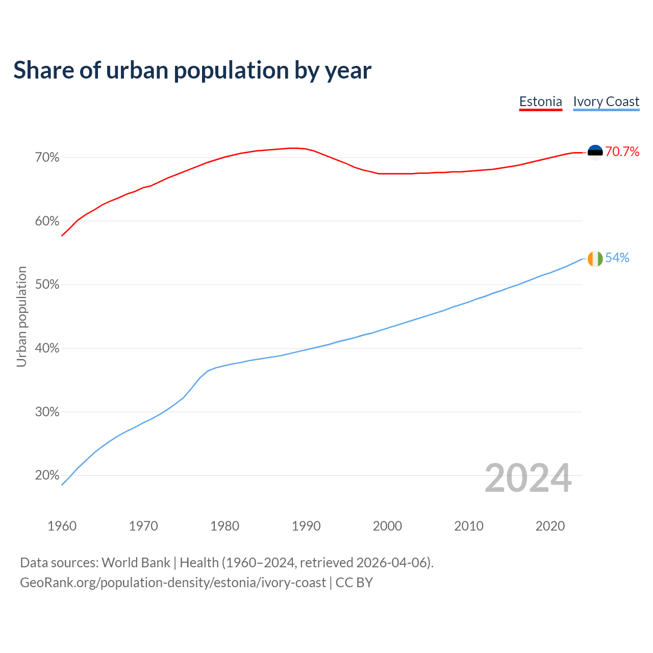 From 2004 to 2024, the share of urban population changed from 67.5% to 70.7% in Estonia and from 44.7% to 54% in Ivory Coast.