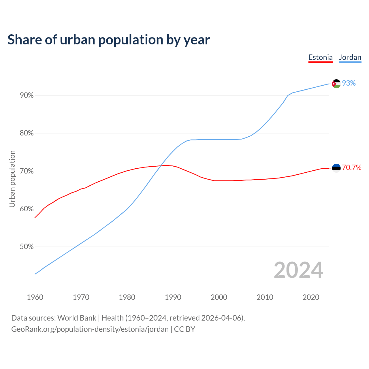 From 2004 to 2024, the share of urban population changed from 67.5% to 70.7% in Estonia and from 78.3% to 93% in Jordan.