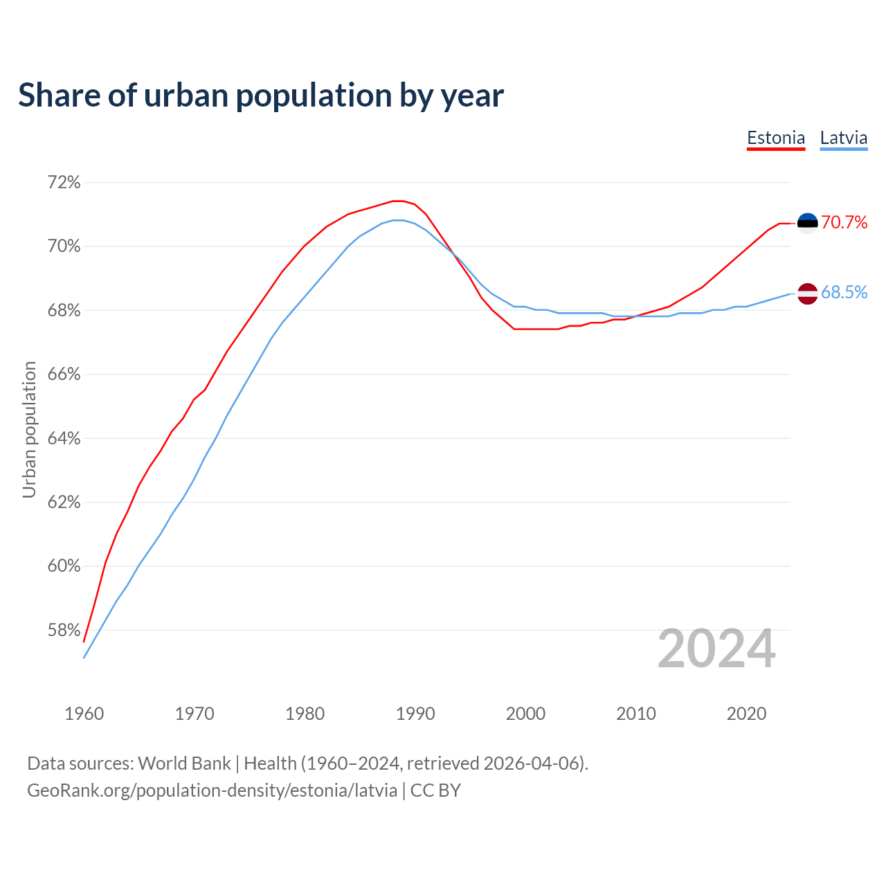 From 2004 to 2024, the share of urban population changed from 67.5% to 70.7% in Estonia and from 67.9% to 68.5% in Latvia.