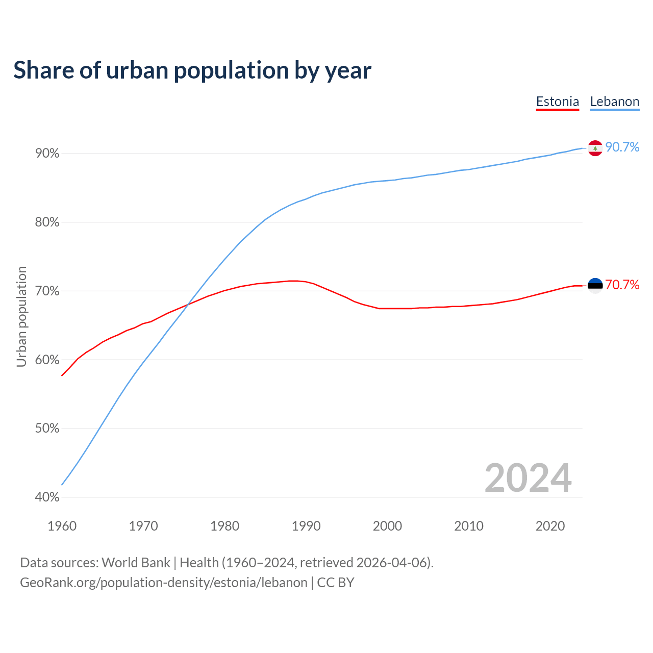 From 2004 to 2024, the share of urban population changed from 67.5% to 70.7% in Estonia and from 86.6% to 90.7% in Lebanon.