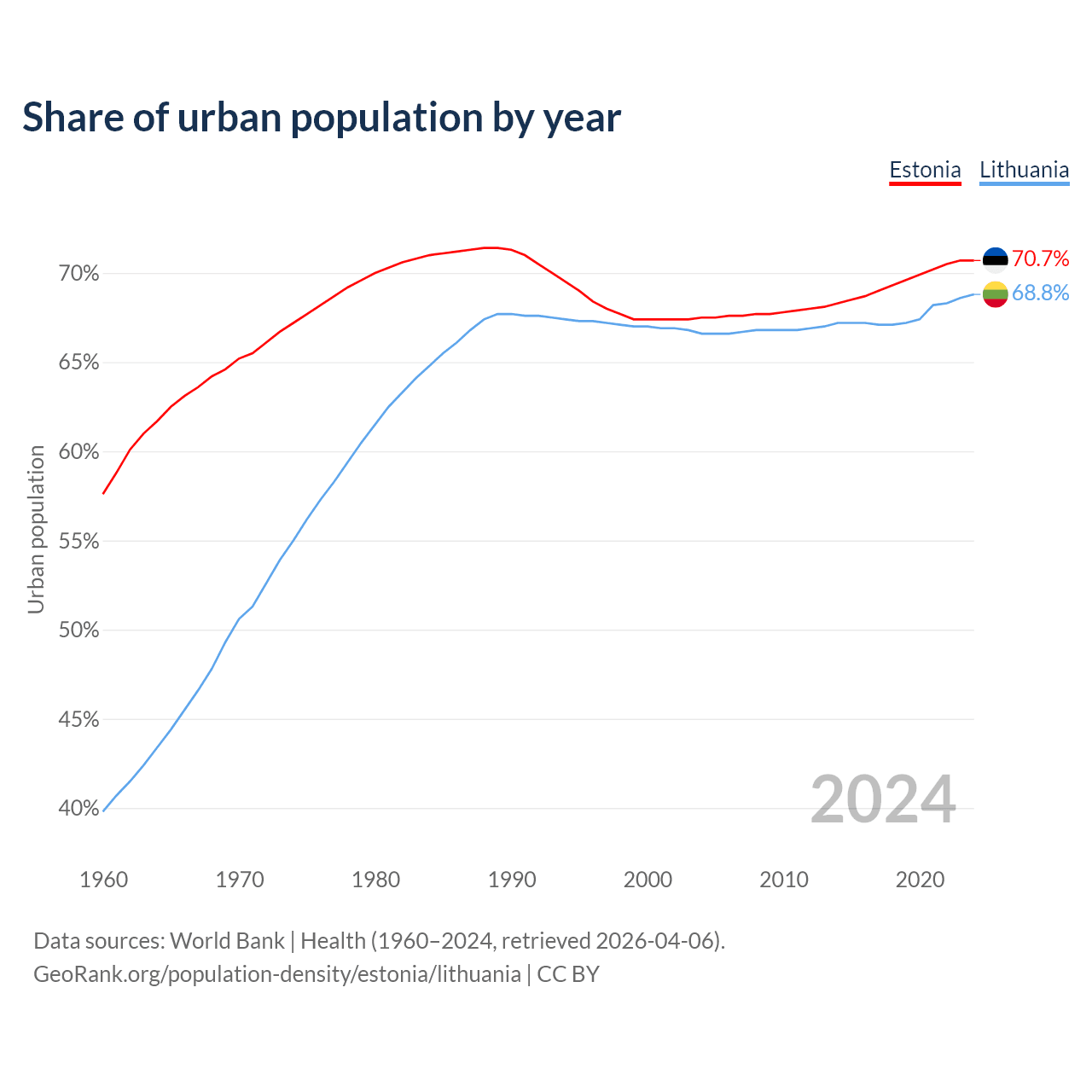 From 2004 to 2024, the share of urban population changed from 67.5% to 70.7% in Estonia and from 66.6% to 68.8% in Lithuania.