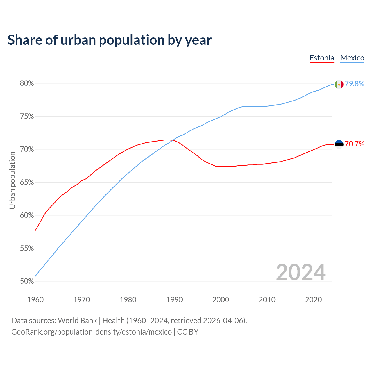 From 2004 to 2024, the share of urban population changed from 67.5% to 70.7% in Estonia and from 76.3% to 79.8% in Mexico.