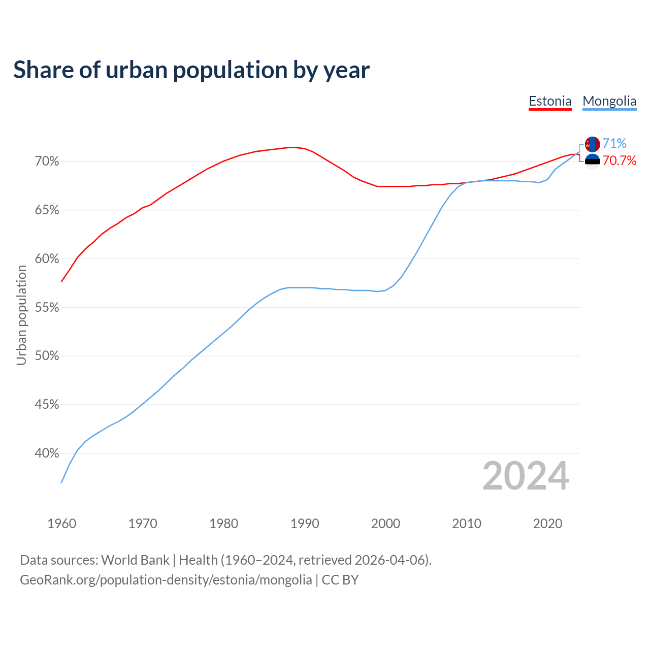 From 2004 to 2024, the share of urban population changed from 67.5% to 70.7% in Estonia and from 60.8% to 71% in Mongolia.