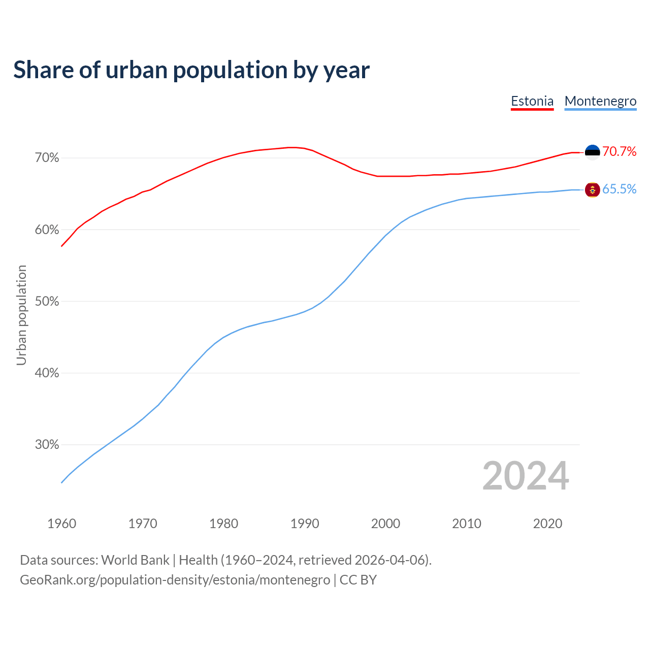 From 2004 to 2024, the share of urban population changed from 67.5% to 70.7% in Estonia and from 62.2% to 65.5% in Montenegro.