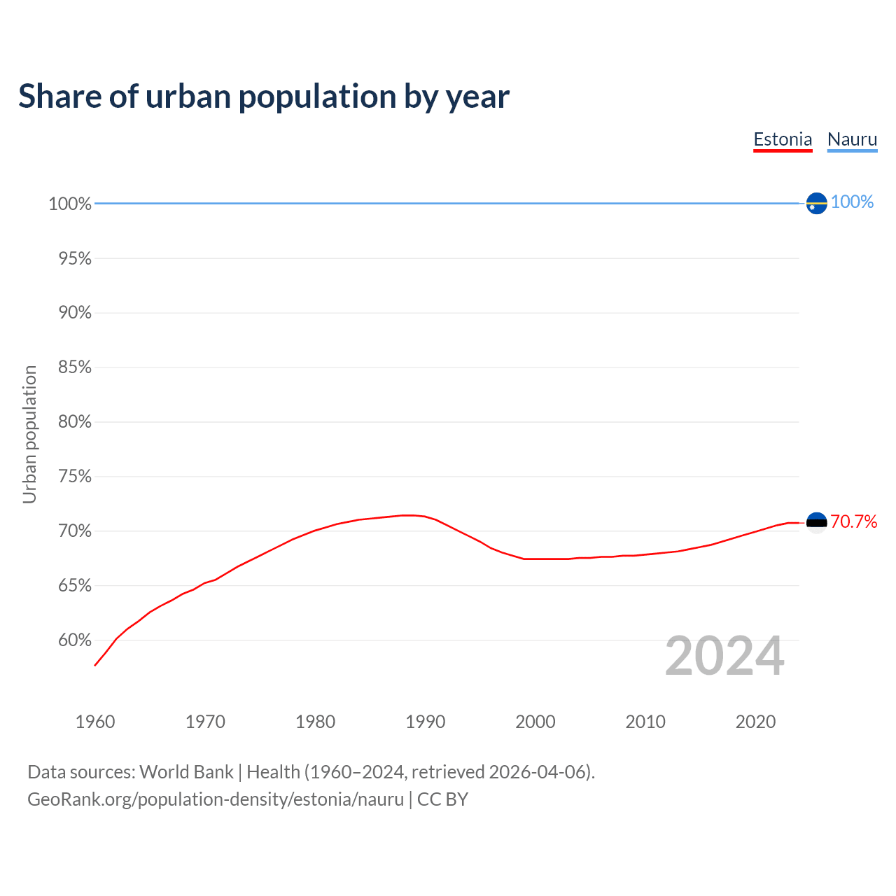From 2004 to 2024, the share of urban population changed from 67.5% to 70.7% in Estonia and from 100% to 100% in Nauru.