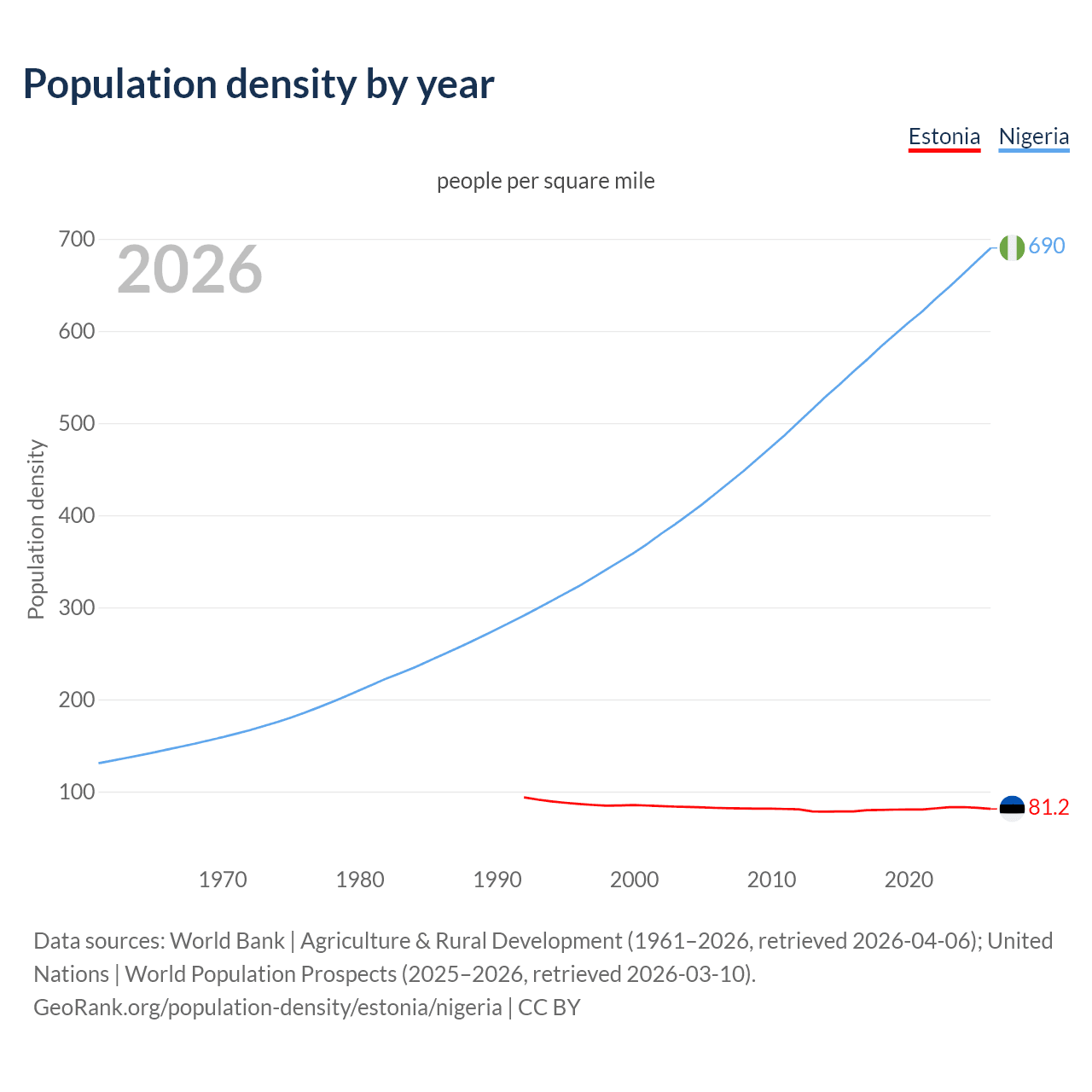 From 2006 to 2026, population density in Estonia decreased by 1.33%, compared to a 62.7% growth in Nigeria.