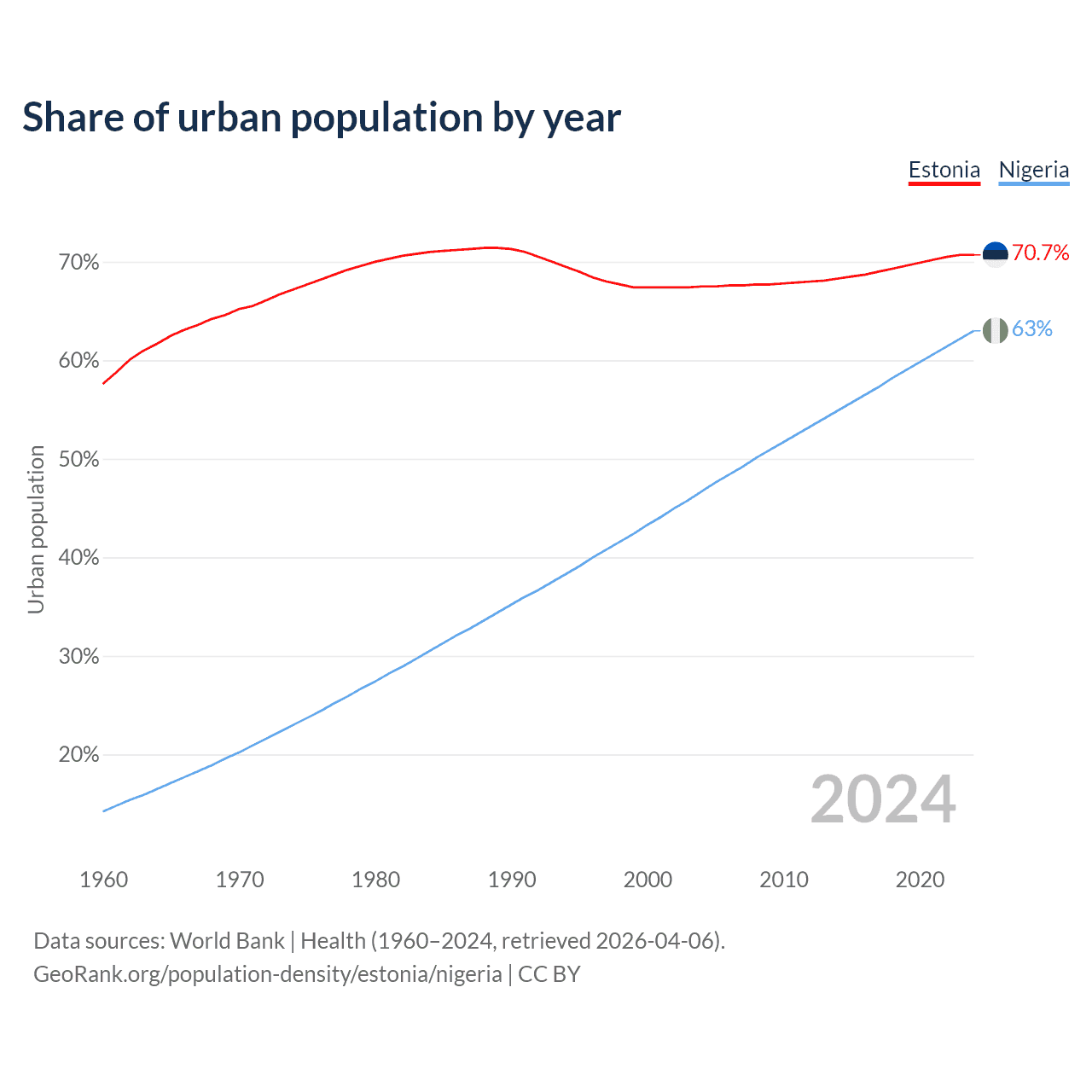 From 2004 to 2024, the share of urban population changed from 67.5% to 70.7% in Estonia and from 46.7% to 63% in Nigeria.