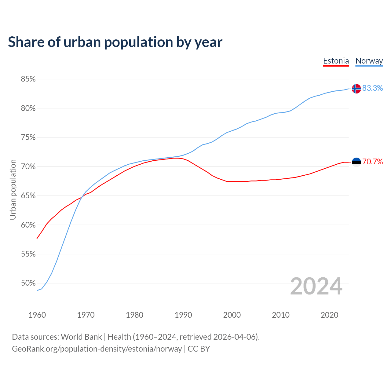 From 2004 to 2024, the share of urban population changed from 67.5% to 70.7% in Estonia and from 77.6% to 83.3% in Norway.