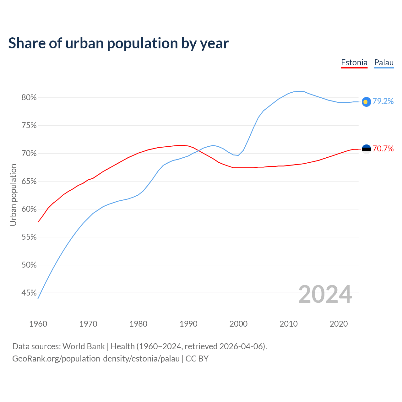 From 2004 to 2024, the share of urban population changed from 67.5% to 70.7% in Estonia and from 76.4% to 79.2% in Palau.