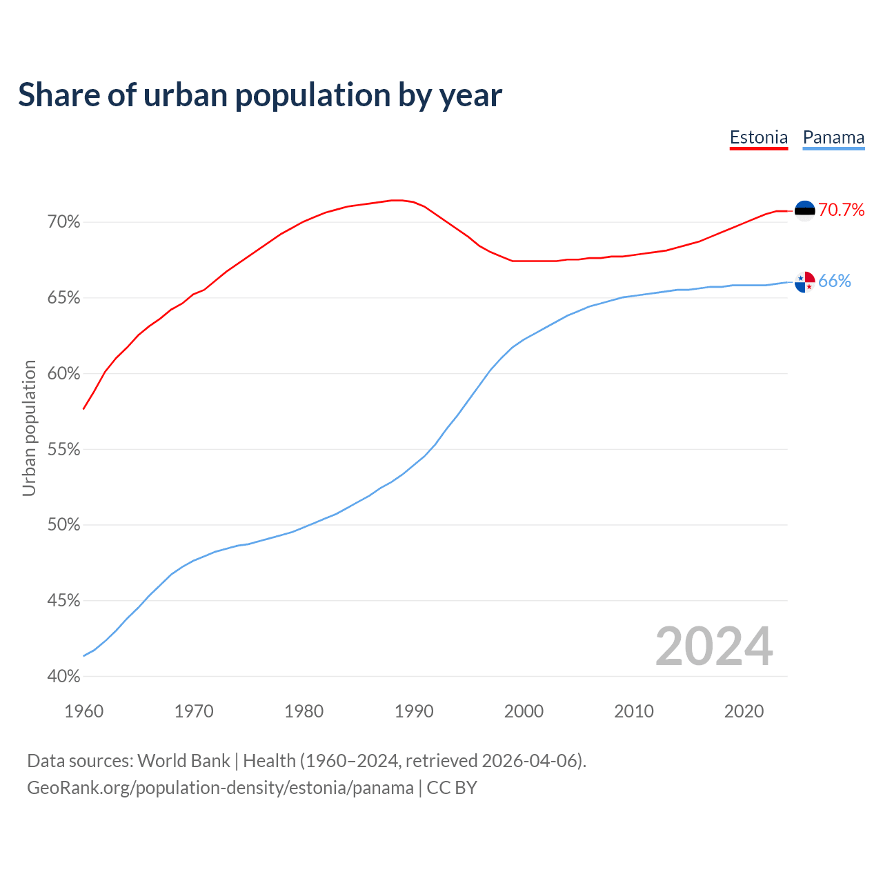 From 2004 to 2024, the share of urban population changed from 67.5% to 70.7% in Estonia and from 63.8% to 66% in Panama.