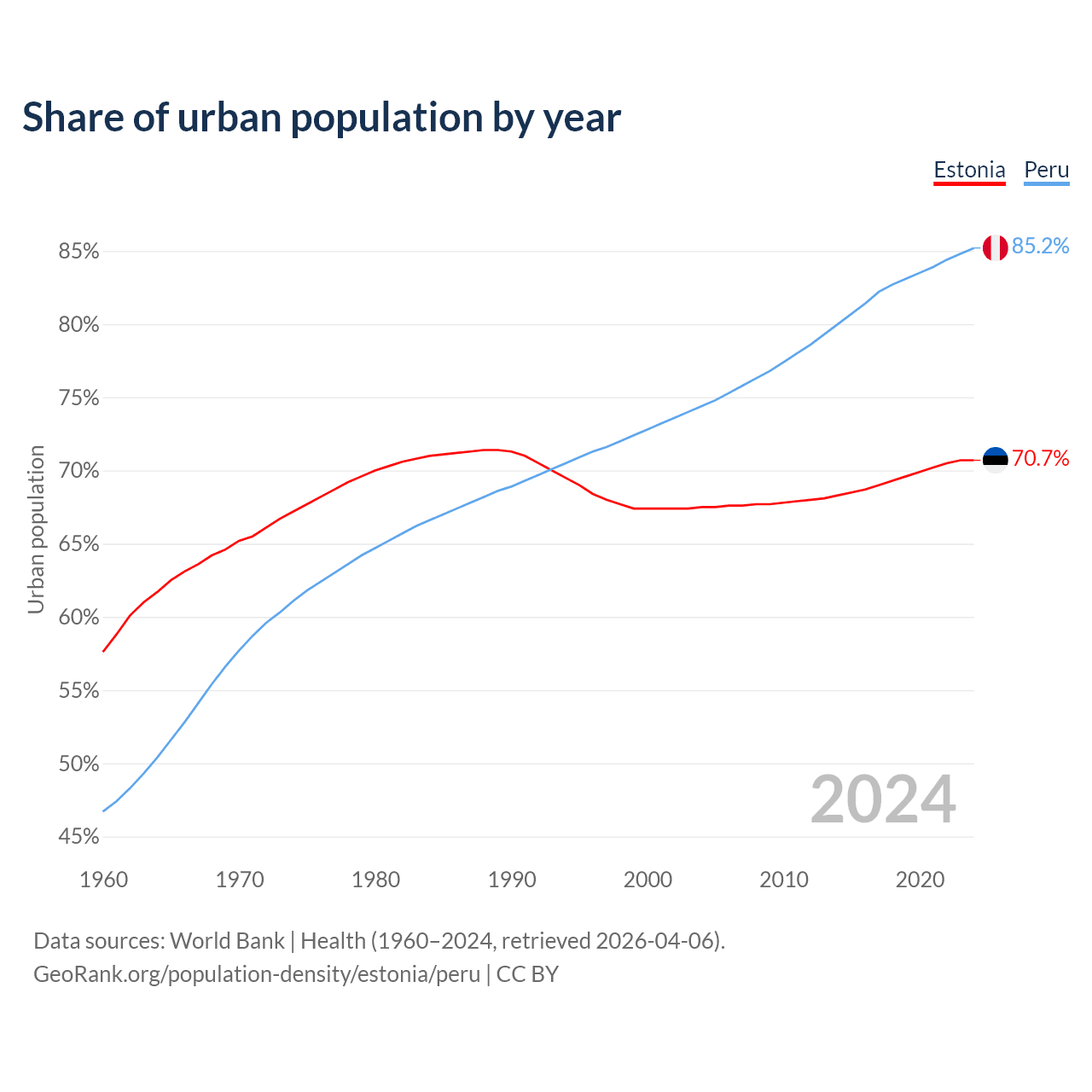 From 2004 to 2024, the share of urban population changed from 67.5% to 70.7% in Estonia and from 74.4% to 85.2% in Peru.