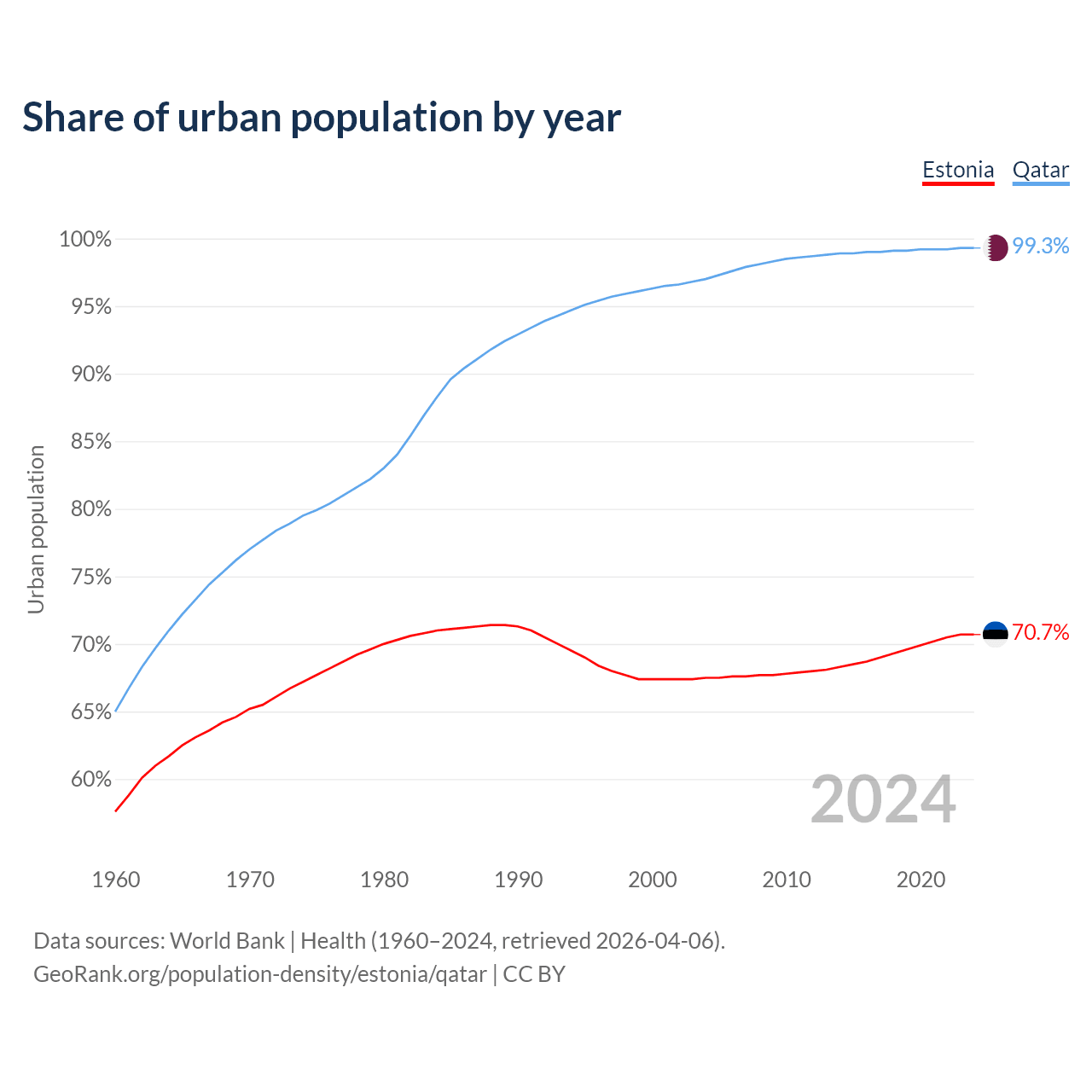 From 2004 to 2024, the share of urban population changed from 67.5% to 70.7% in Estonia and from 97% to 99.3% in Qatar.