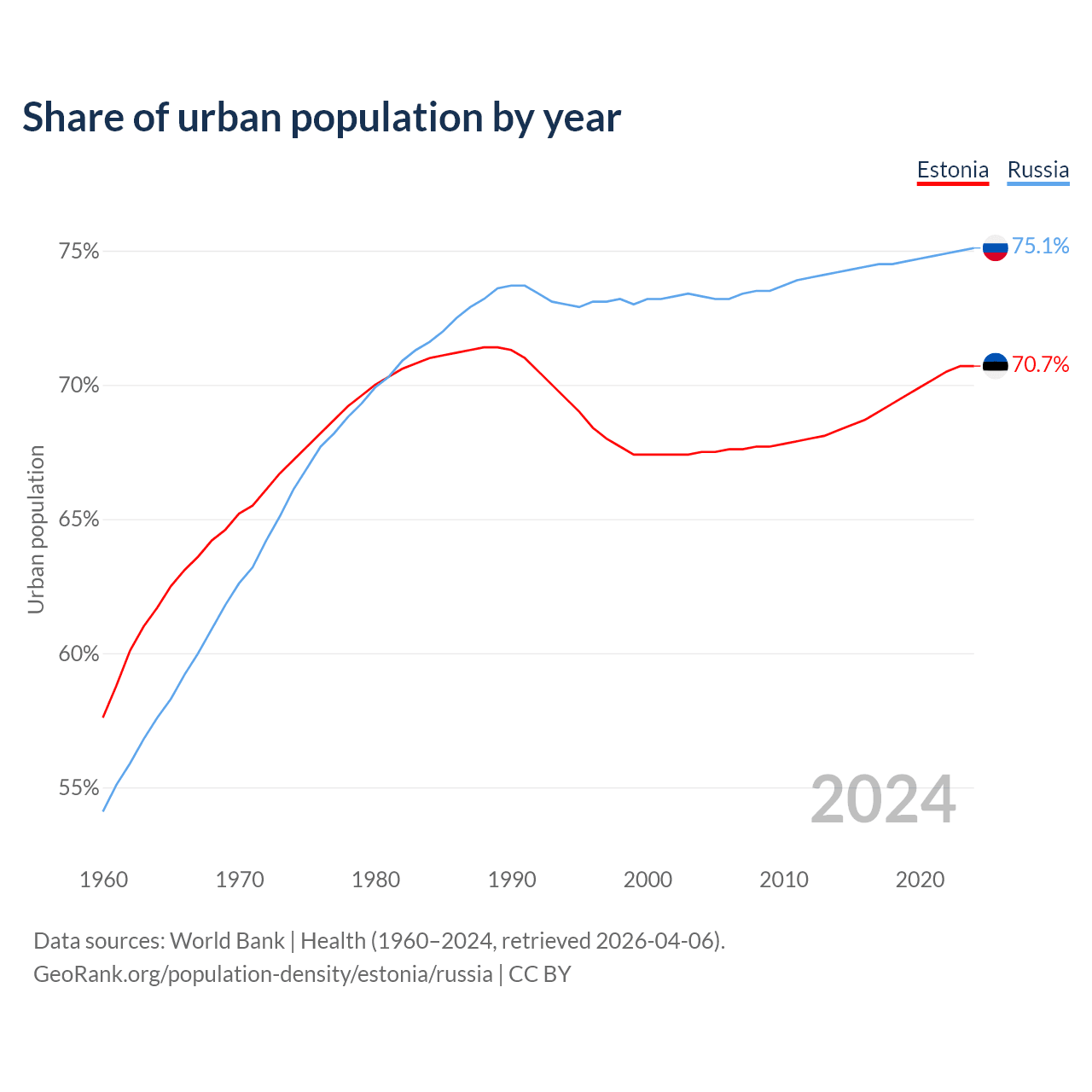 From 2004 to 2024, the share of urban population changed from 67.5% to 70.7% in Estonia and from 73.3% to 75.1% in Russia.