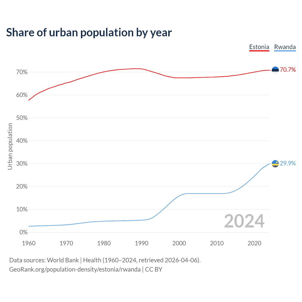 From 2004 to 2024, the share of urban population changed from 67.5% to 70.7% in Estonia and from 16.9% to 29.9% in Rwanda.
