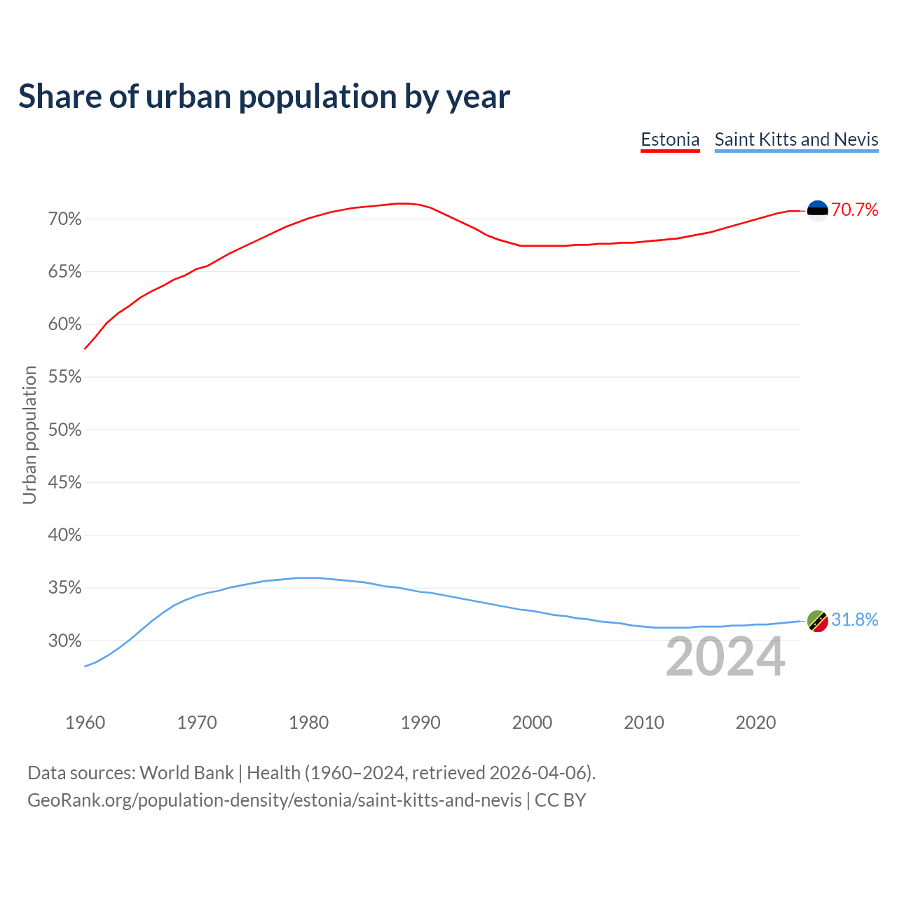 From 2004 to 2024, the share of urban population changed from 67.5% to 70.7% in Estonia and from 32.1% to 31.8% in Saint Kitts and Nevis.
