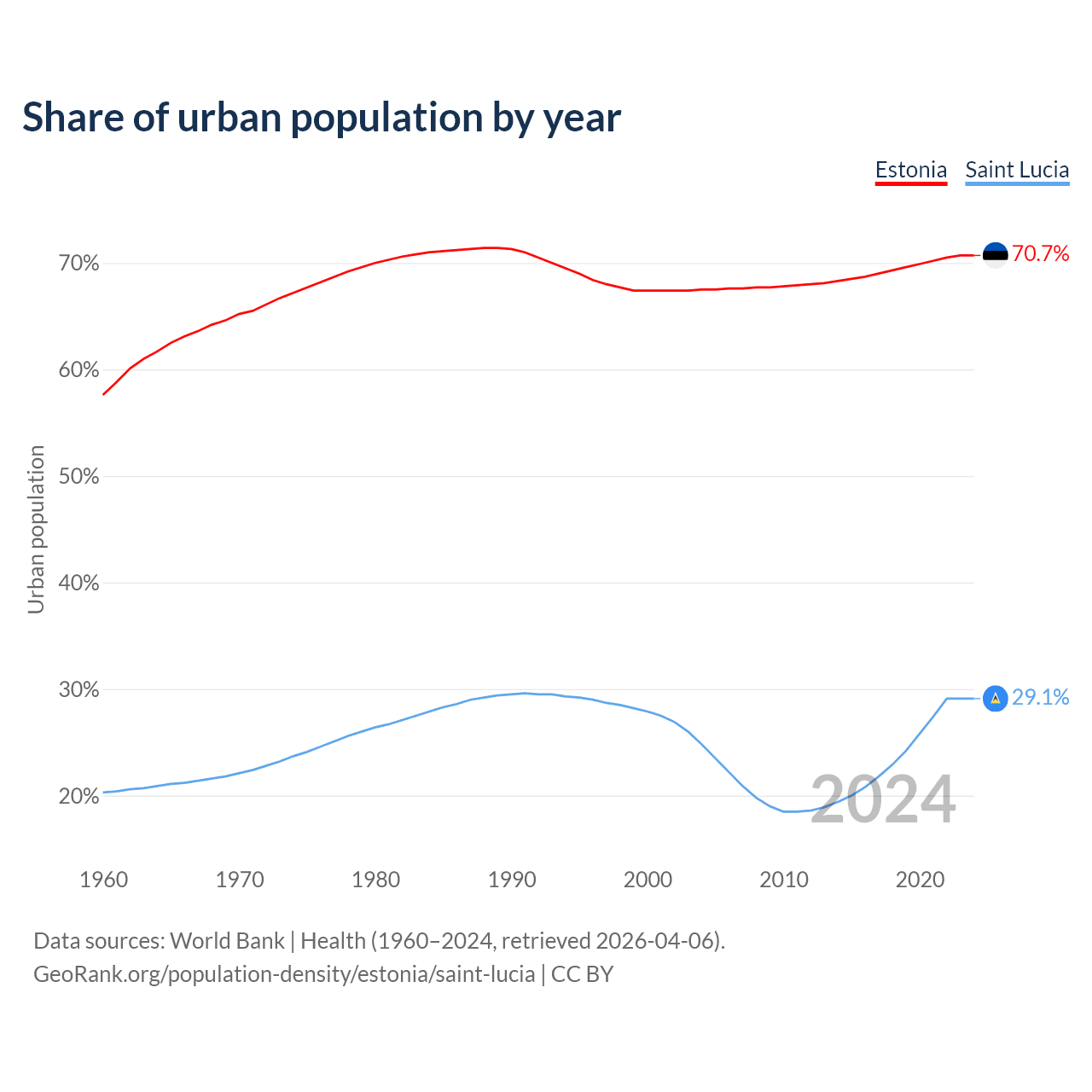 From 2004 to 2024, the share of urban population changed from 67.5% to 70.7% in Estonia and from 24.8% to 29.1% in Saint Lucia.
