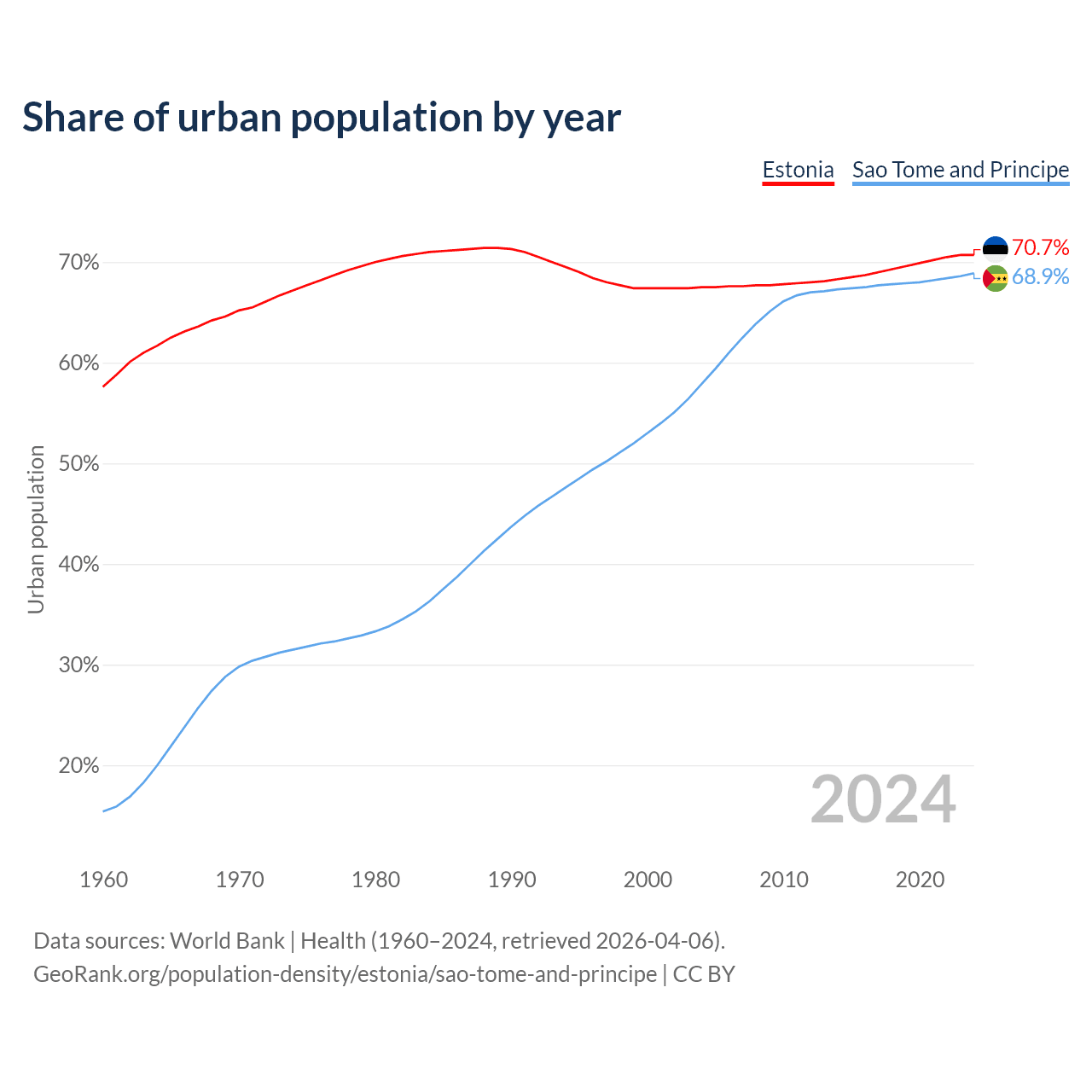 From 2004 to 2024, the share of urban population changed from 67.5% to 70.7% in Estonia and from 57.9% to 68.9% in Sao Tome and Principe.