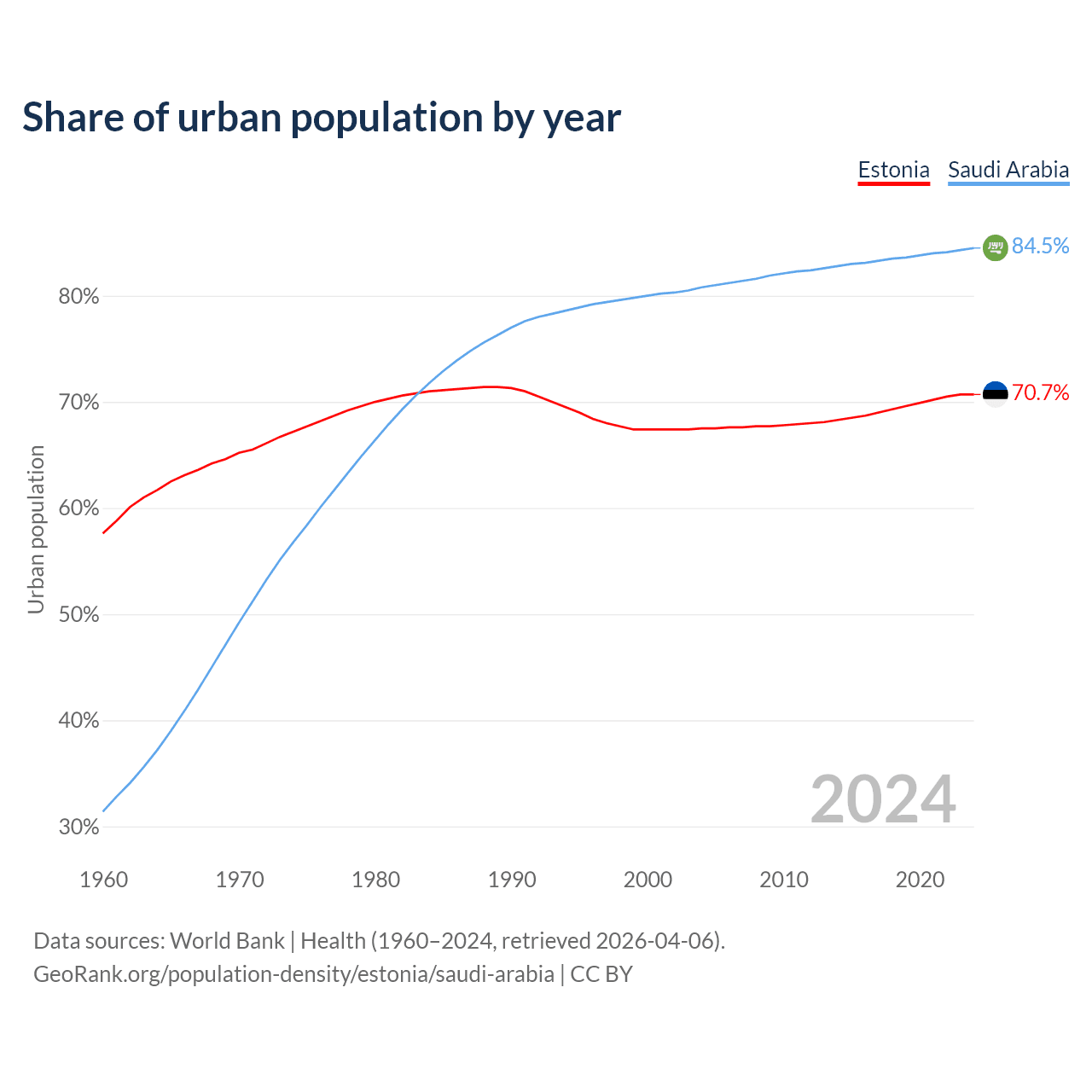 From 2004 to 2024, the share of urban population changed from 67.5% to 70.7% in Estonia and from 80.8% to 84.5% in Saudi Arabia.