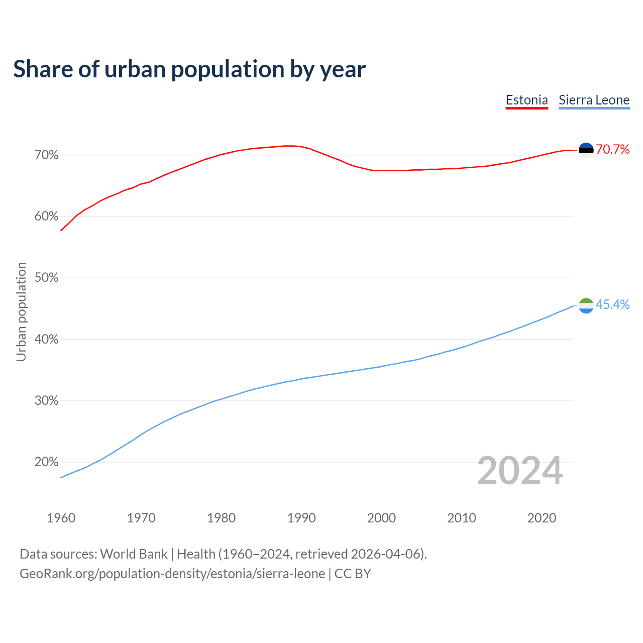 From 2004 to 2024, the share of urban population changed from 67.5% to 70.7% in Estonia and from 36.5% to 45.4% in Sierra Leone.