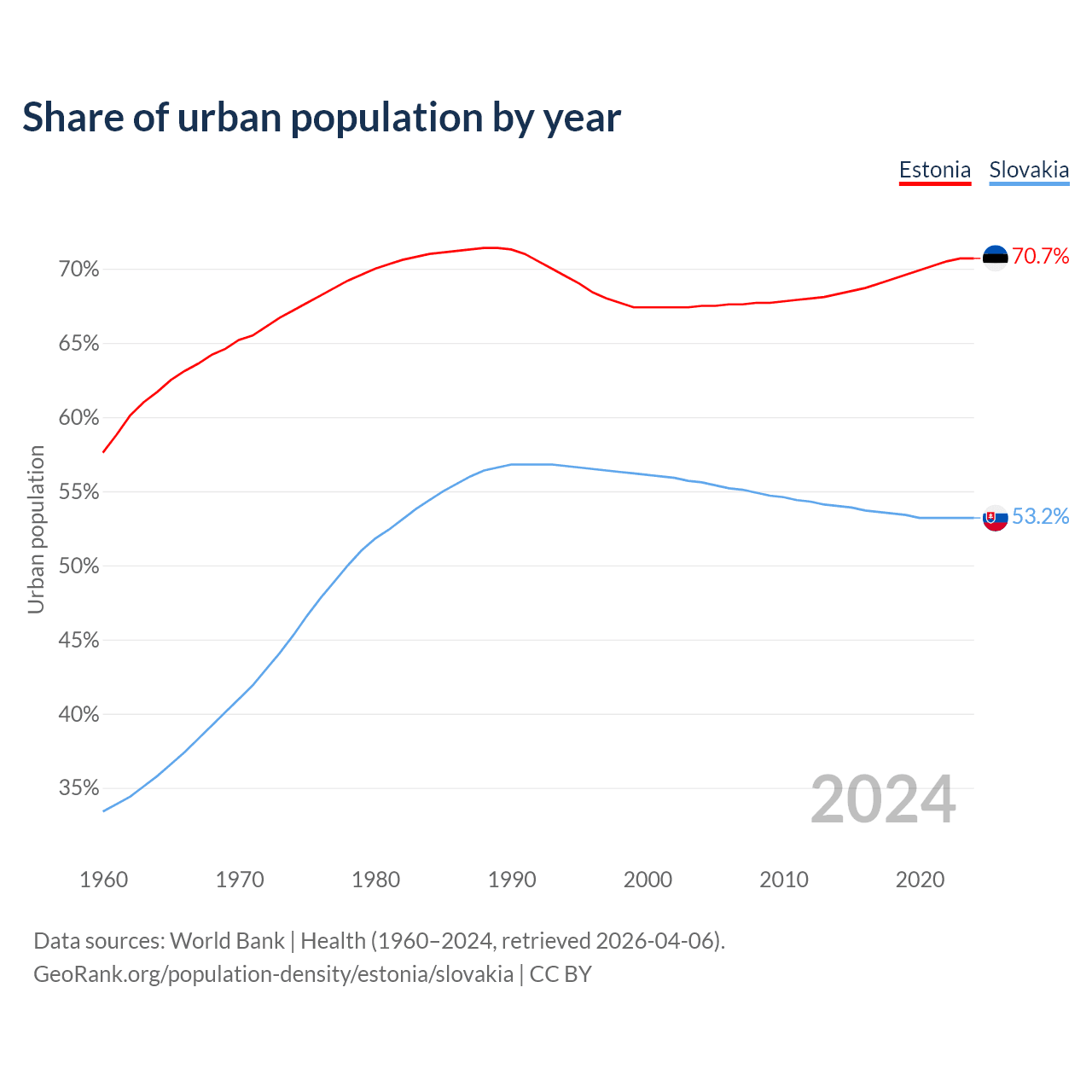 From 2004 to 2024, the share of urban population changed from 67.5% to 70.7% in Estonia and from 55.6% to 53.2% in Slovakia.
