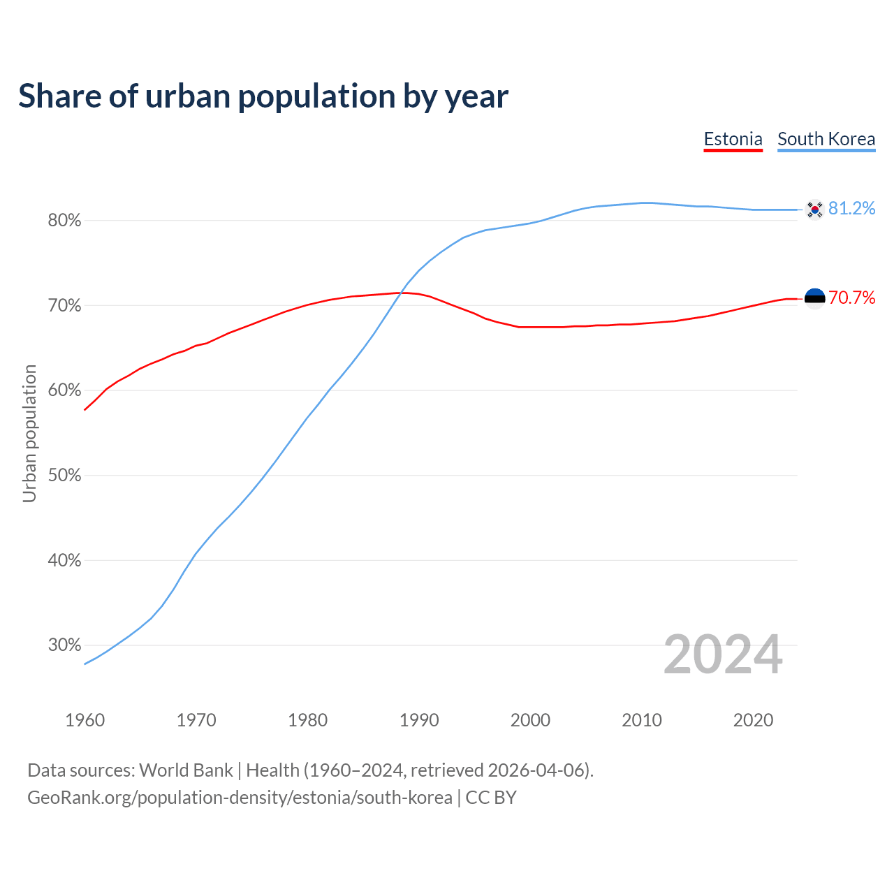 From 2004 to 2024, the share of urban population changed from 67.5% to 70.7% in Estonia and from 81.1% to 81.2% in South Korea.
