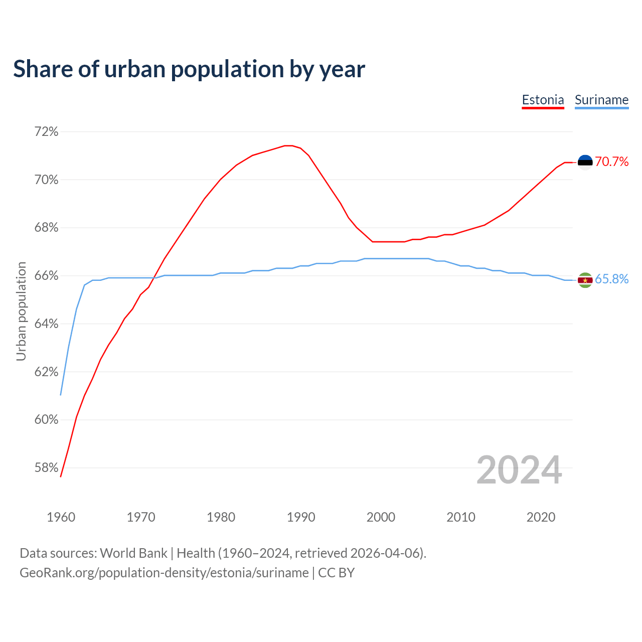 From 2004 to 2024, the share of urban population changed from 67.5% to 70.7% in Estonia and from 66.7% to 65.8% in Suriname.