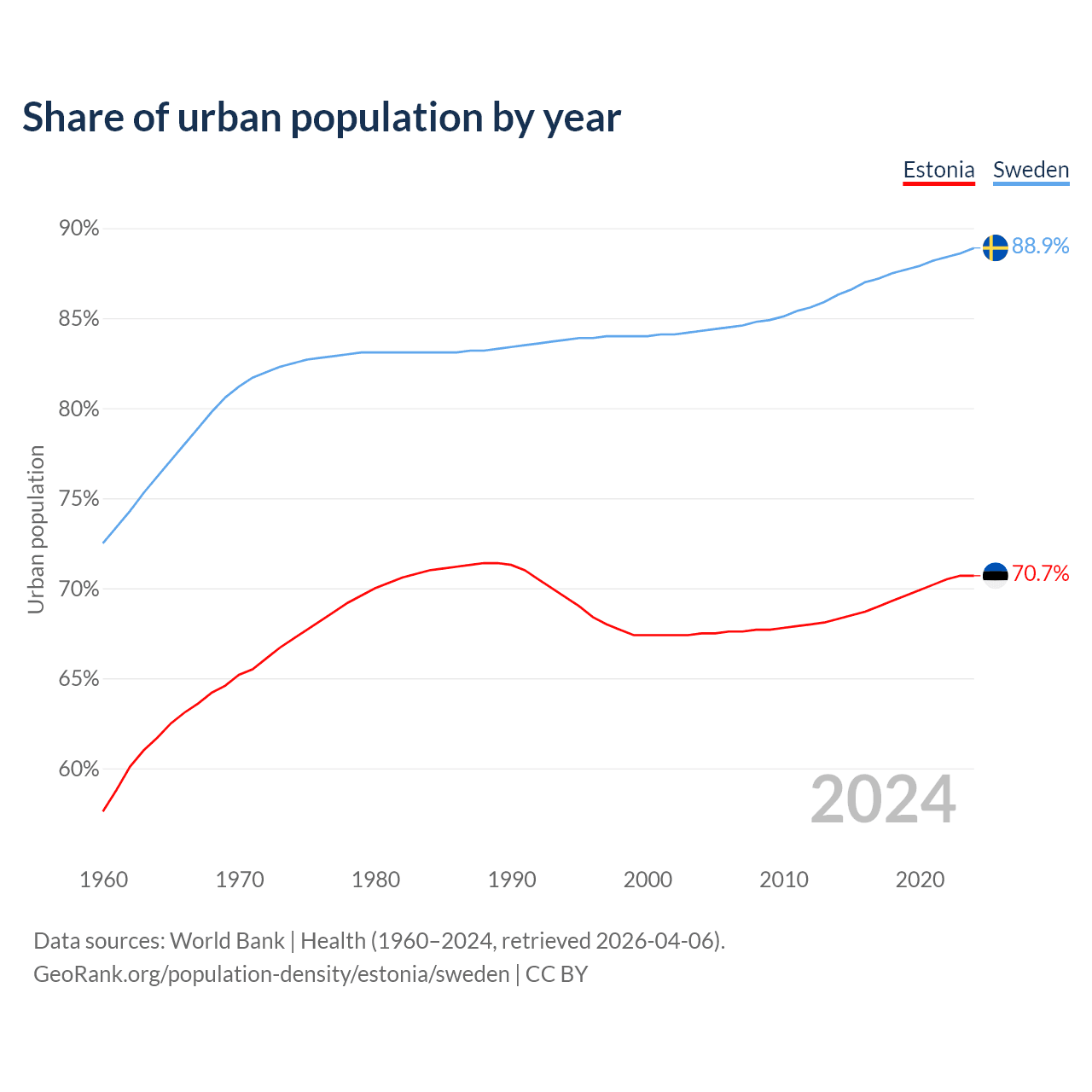 From 2004 to 2024, the share of urban population changed from 67.5% to 70.7% in Estonia and from 84.3% to 88.9% in Sweden.