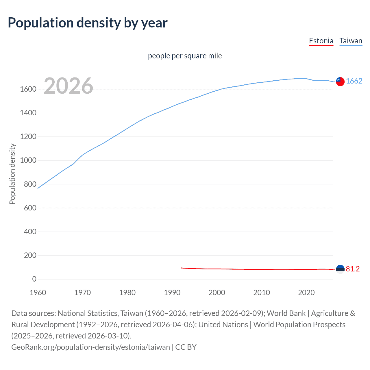 From 2006 to 2026, population density in Estonia decreased by 1.33%, compared to a 1.78% growth in Taiwan.