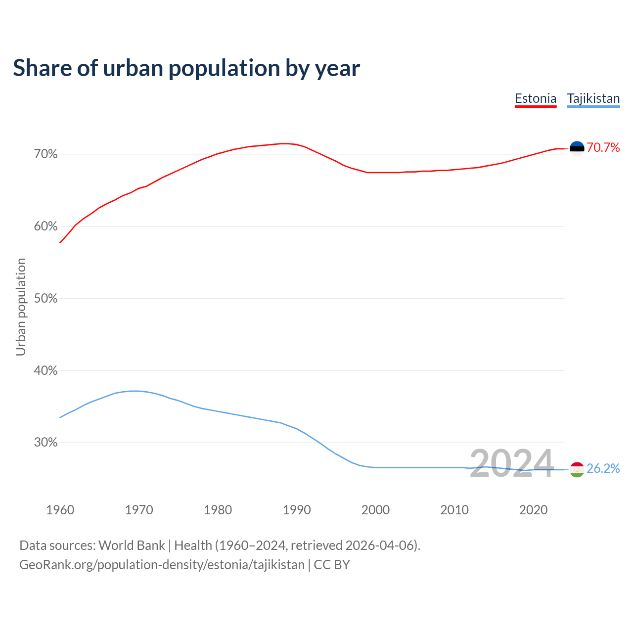From 2004 to 2024, the share of urban population changed from 67.5% to 70.7% in Estonia and from 26.5% to 26.2% in Tajikistan.