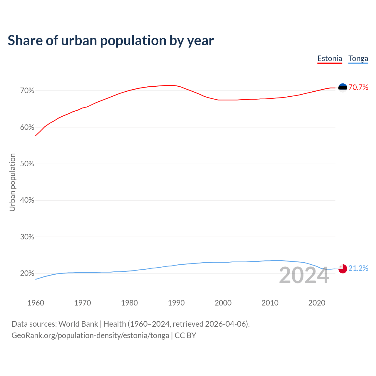 From 2004 to 2024, the share of urban population changed from 67.5% to 70.7% in Estonia and from 23.1% to 21.2% in Tonga.