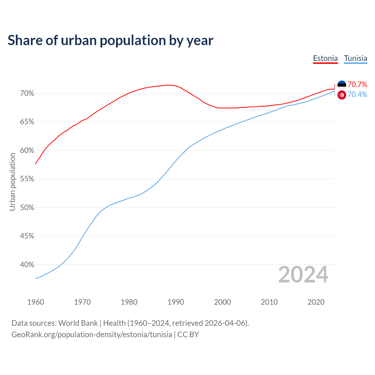 From 2004 to 2024, the share of urban population changed from 67.5% to 70.7% in Estonia and from 64.9% to 70.4% in Tunisia.