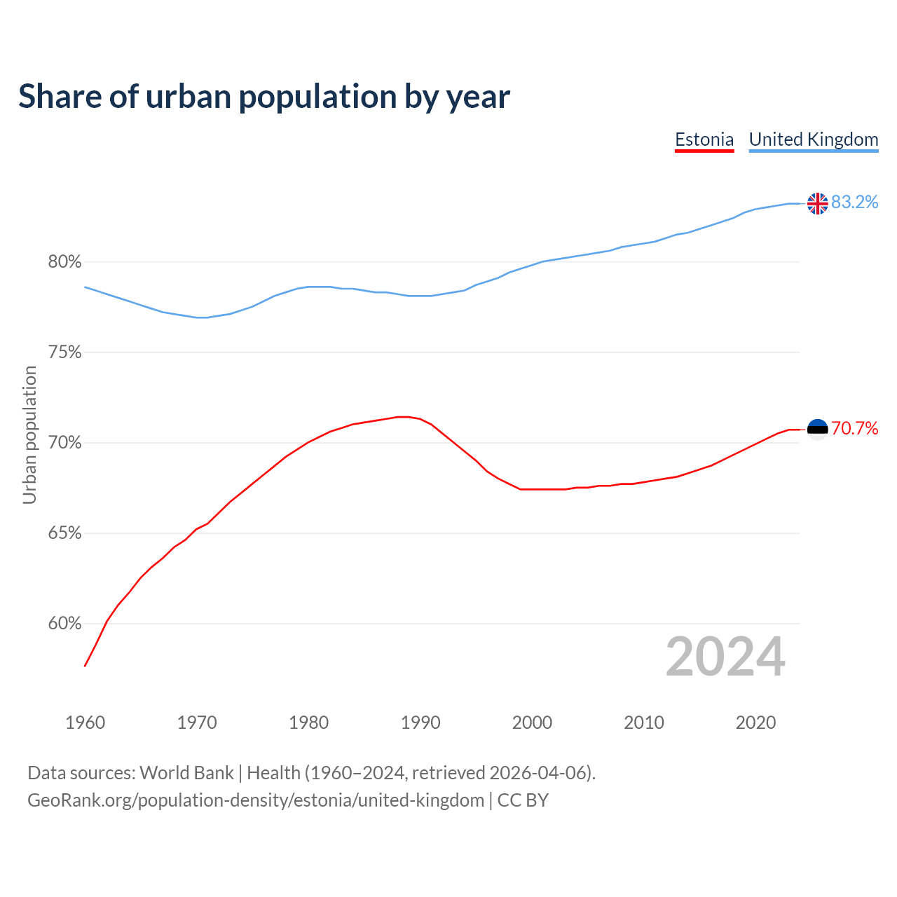 From 2004 to 2024, the share of urban population changed from 67.5% to 70.7% in Estonia and from 80.3% to 83.2% in the United Kingdom.