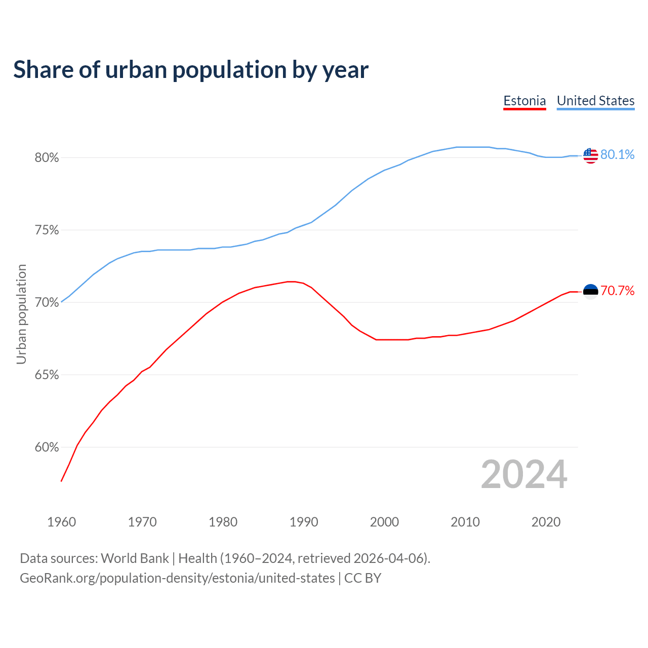 From 2004 to 2024, the share of urban population changed from 67.5% to 70.7% in Estonia and from 80% to 80.1% in the United States.