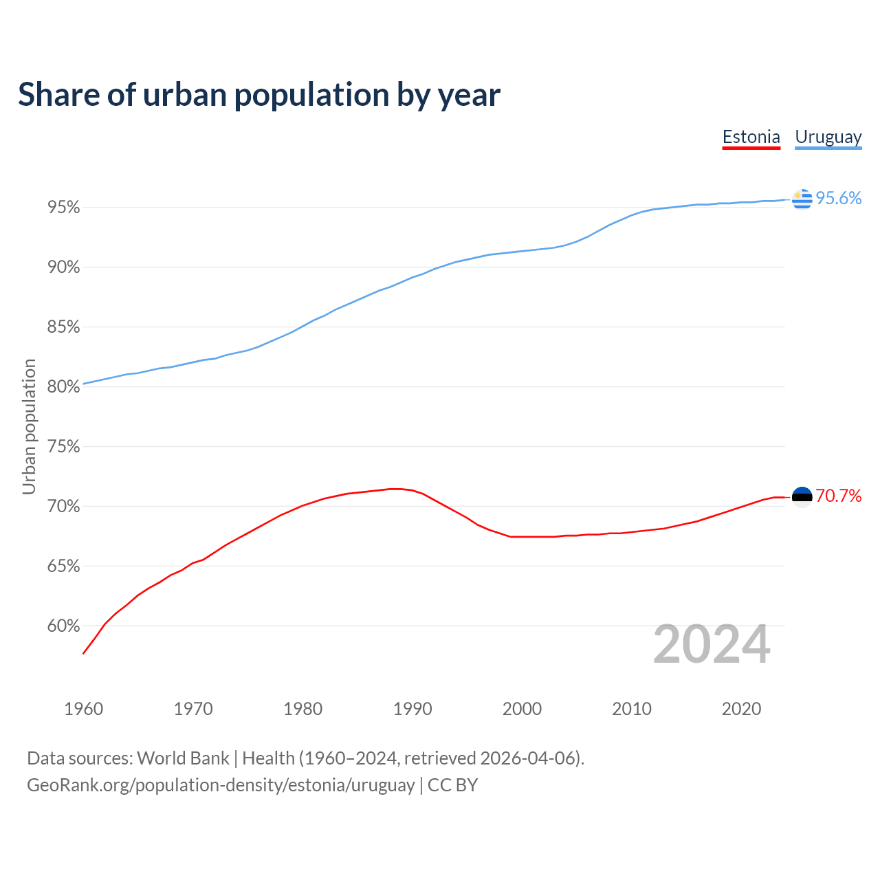 From 2004 to 2024, the share of urban population changed from 67.5% to 70.7% in Estonia and from 91.8% to 95.6% in Uruguay.