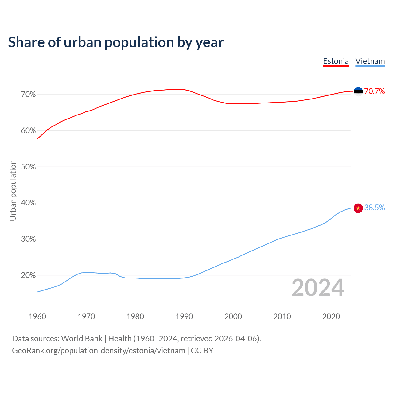 From 2004 to 2024, the share of urban population changed from 67.5% to 70.7% in Estonia and from 26.8% to 38.5% in Vietnam.