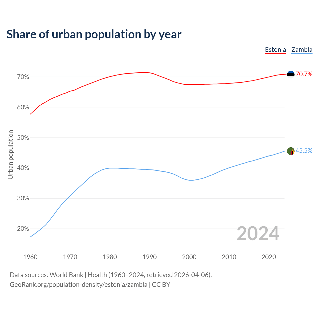 From 2004 to 2024, the share of urban population changed from 67.5% to 70.7% in Estonia and from 36.8% to 45.5% in Zambia.