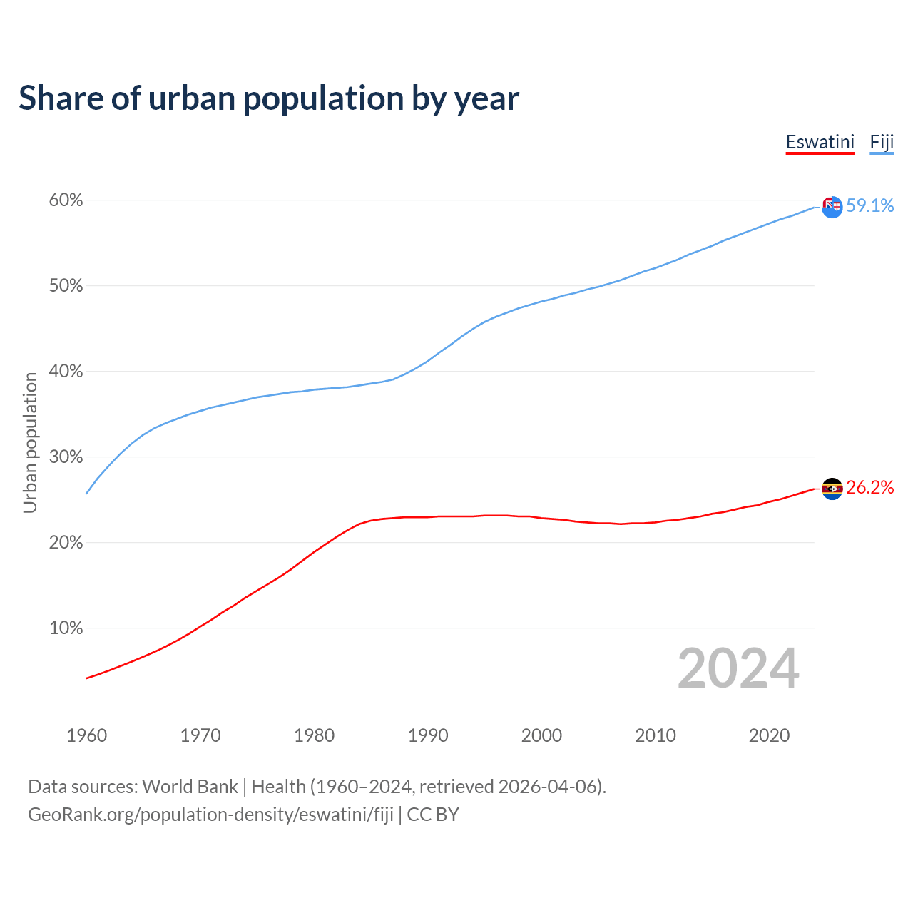 From 2004 to 2024, the share of urban population changed from 22.3% to 26.2% in Eswatini and from 49.5% to 59.1% in Fiji.